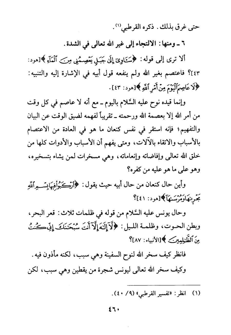 ألا ترى إلى قوله: {سَآوِي إِلَى جَبَلٍ يَعْصِمُنِي مِنَ الْمَاءِ} [هود: 43]؟ فاعتصم بغير الله ولم ينفعه قول أبيه في الإشارة إليه والتنبيه: {لَا عَاصِمَ الْيَوْمَ مِنْ أَمْرِ اللَّهِ} [هود: 43].