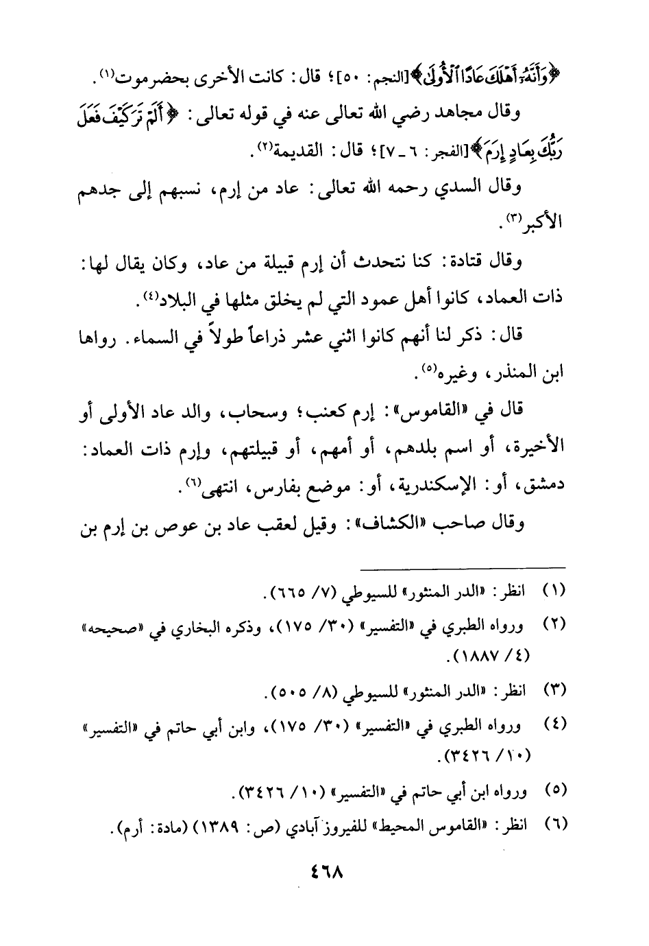 قال في "القاموس": إرم كعنب؛ وسحاب، والد عاد الأولى أو الأخيرة، أو اسم بلدهم، أو أمهم، أو قبيلتهم، وإرم ذات العماد: دمشق، أو: الإسكندرية، أو: موضع بفارس، انتهى (¬6).