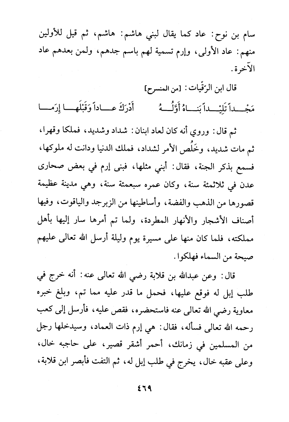 ثم قال: وروي أنه كان لعاد ابنان: شداد وشديد، فملكا وقهرا، ثم مات شديد، وخَلُص الأمر لشداد، فملك الدنيا ودانت له ملوكها، فسمع بذكر الجنة، فقال: أبني مثلها، فبنى إرم في بعض صحارى عدن في ثلاثمئة سنة، وكان عمره سبعمئة سنة، وهي مدينة عظيمة قصورها من الذهب والفضة، وأساطينها من الزبرجد والياقوت، وفيها أصناف الأشجار والأنهار المطردة، ولما تم أمرها سار إليها بأهل مملكته، فلما كان منها على مسيرة يوم وليلة أرسل الله تعالى عليهم صيحة من السماء فهلكوا.