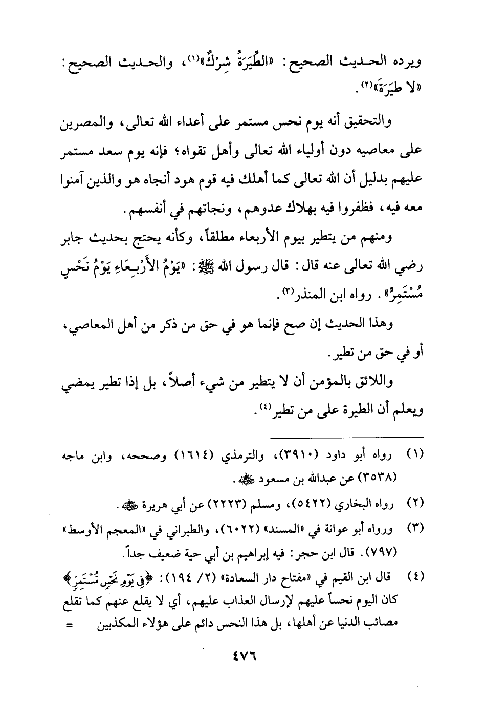 ومنهم من يتطير بيوم الأربعاء مطلقا، وكأنه يحتج بحديث جابر رضي الله تعالى عنه قال: قال رسول الله - صلى الله عليه وسلم -: "يَوْمُ الأَرْبِعَاءِ يَوْمُ نَحْسٍ مُسْتَمِرٍّ". رواه ابن المنذر (¬3).