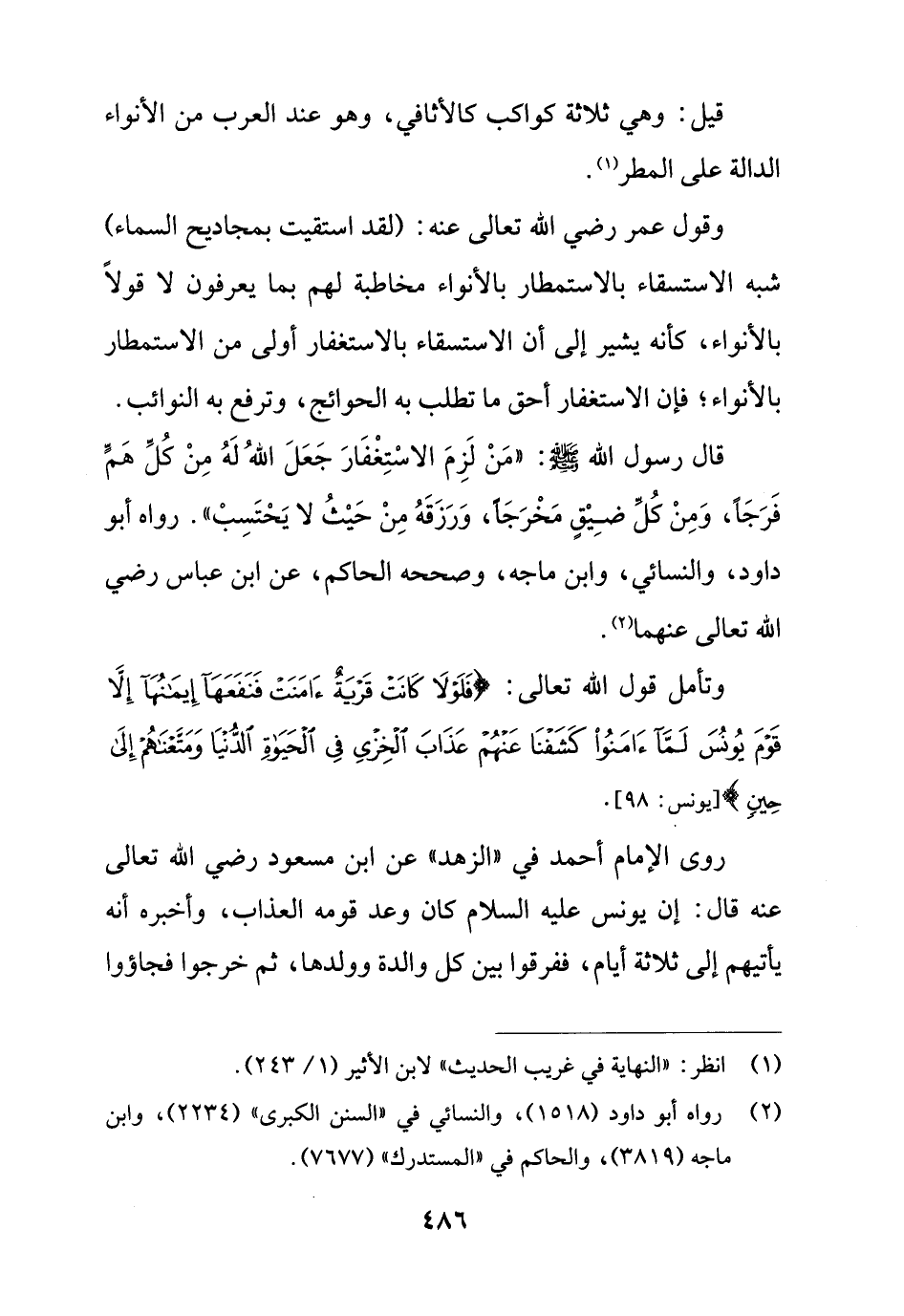 وقول عمر رضي الله تعالى عنه: (لقد استقيت بمجاديح السماء) شبه الاستسقاء بالاستمطار بالأنواء مخاطبة لهم بما يعرفون لا قولاً بالأنواء، كأنه يشير إلى أن الاستسقاء بالاستغفار أولى من الاستمطار بالأنواء؛ فإن الاستغفار أحق ما تطلب به الحوائج، وترفع به النوائب.