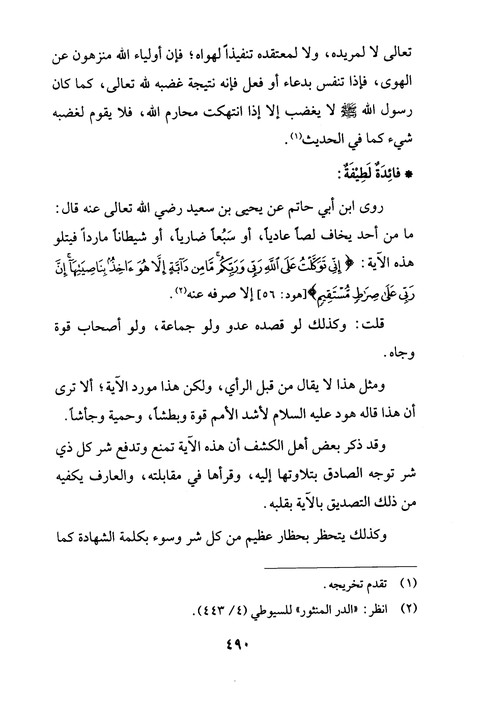 روى ابن أبي حاتم عن يحيى بن سعيد رضي الله تعالى عنه قال: ما من أحد يخاف لصاً عادياً، أو سَبُعاً ضارياً، أو شيطاناً مارداً فيتلو هذه الآية: {إِنِّي تَوَكَّلْتُ عَلَى اللَّهِ رَبِّي وَرَبِّكُمْ مَا مِنْ دَابَّةٍ إِلَّا هُوَ آخِذٌ بِنَاصِيَتِهَا إِنَّ رَبِّي عَلَى صِرَاطٍ مُسْتَقِيمٍ} [هود: 56] إلا صرفه عنه (¬2).