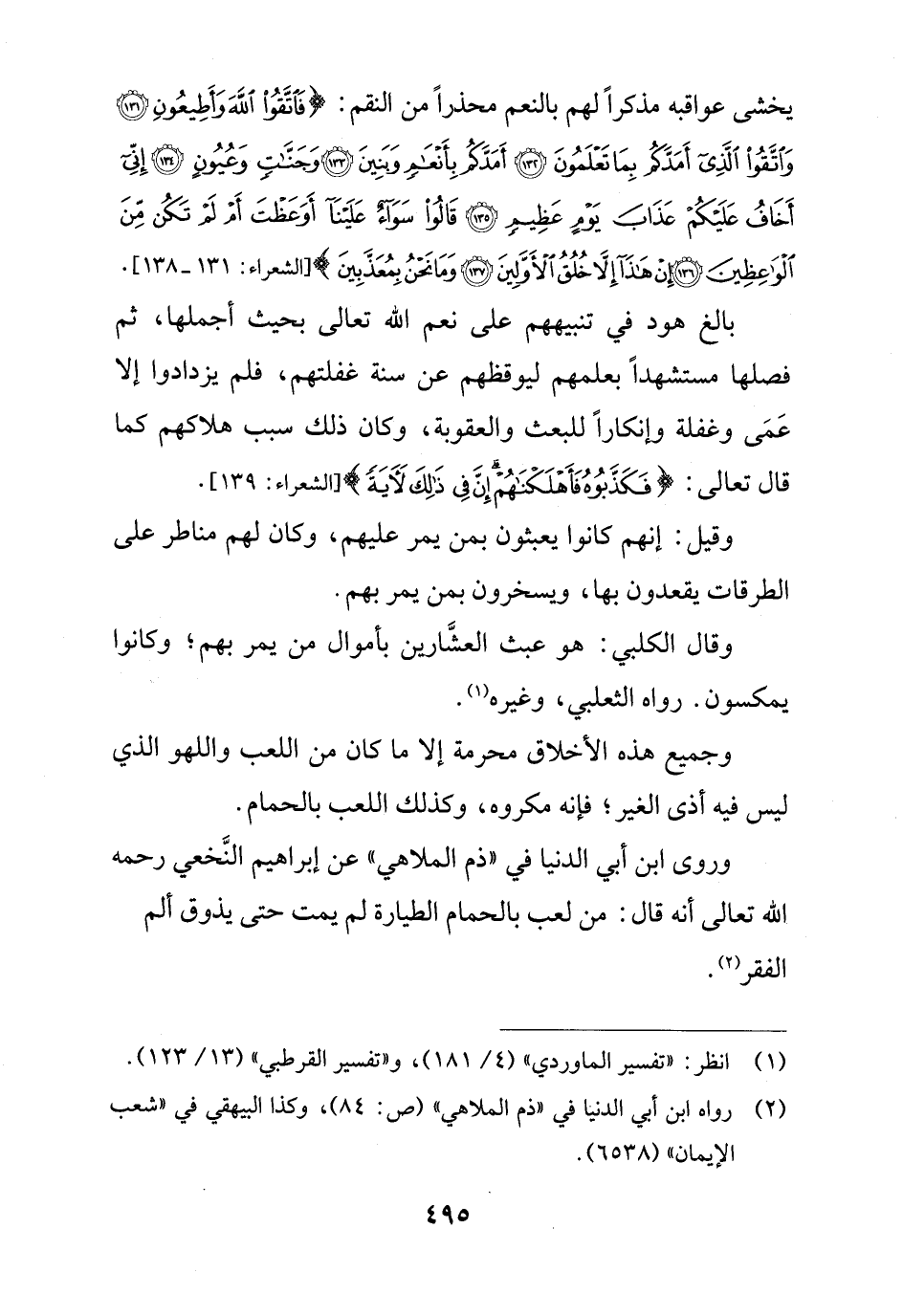 وَاتَّقُوا الَّذِي أَمَدَّكُمْ بِمَا تَعْلَمُونَ (132) أَمَدَّكُمْ بِأَنْعَامٍ وَبَنِينَ (133) وَجَنَّاتٍ وَعُيُونٍ (134) إِنِّي أَخَافُ عَلَيْكُمْ عَذَابَ يَوْمٍ عَظِيمٍ (135) قَالُوا سَوَاءٌ عَلَيْنَا أَوَعَظْتَ أَمْ لَمْ تَكُنْ مِنَ الْوَاعِظِينَ (136) إِنْ هَذَا إِلَّا خُلُقُ الْأَوَّلِينَ (137) وَمَا نَحْنُ بِمُعَذَّبِينَ} [الشعراء: 131 - 138].