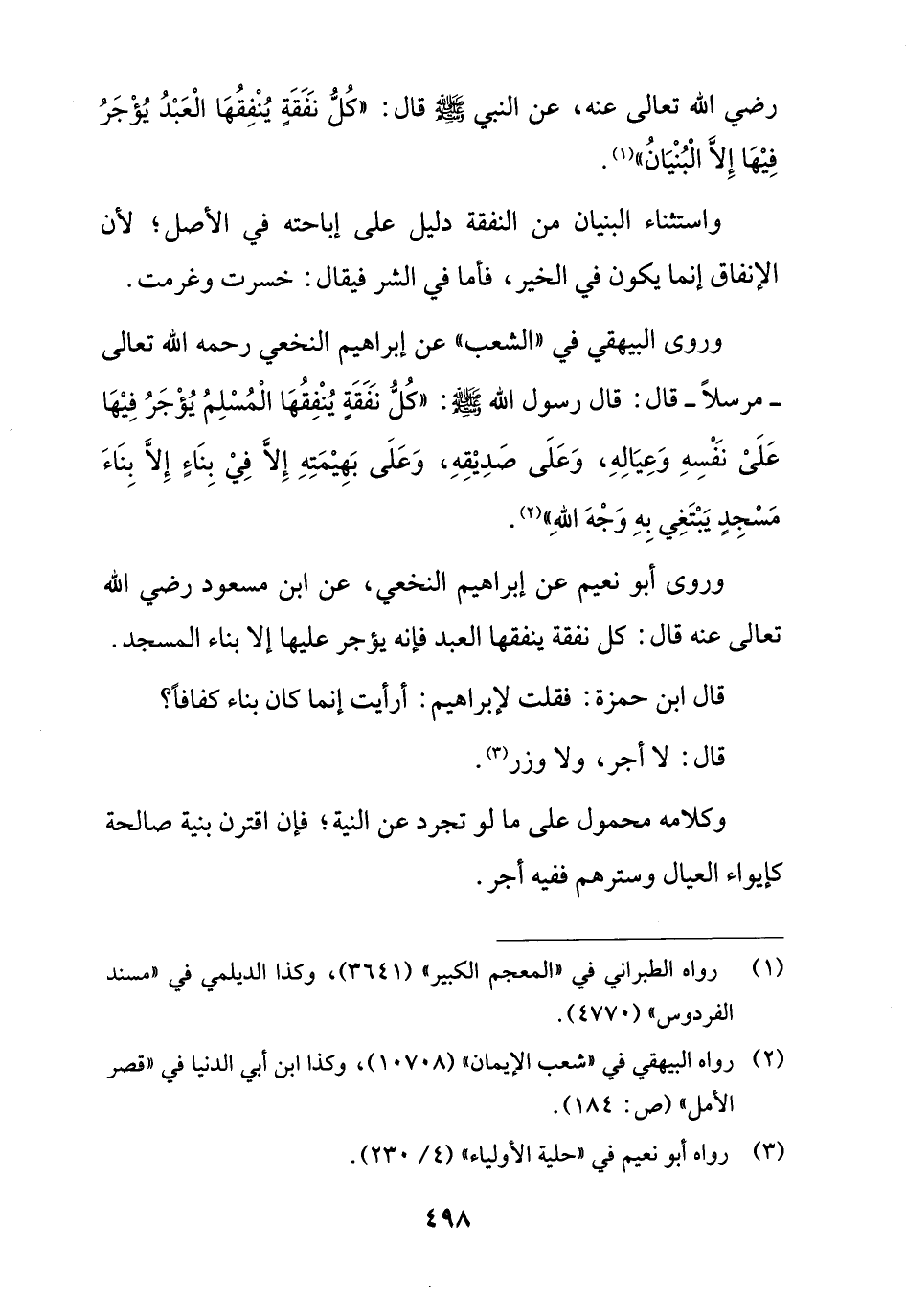 وروى أبو نعيم عن إبراهيم النخعي، عن ابن مسعود رضي الله تعالى عنه قال: كل نفقة ينفقها العبد فإنه يؤجر عليها إلا بناء المسجد.