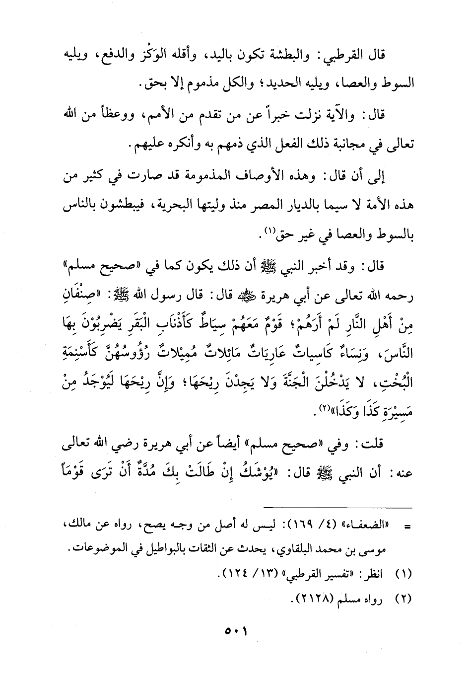 قال: وقد أخبر النبي - صلى الله عليه وسلم - أن ذلك يكون كما في "صحيح مسلم" رحمه الله تعالى عن أبي هريرة - رضي الله عنه - قال: قال رسول الله - صلى الله عليه وسلم -: "صِنْفَانِ مِنْ أَهْلِ النَّارِ لَمْ أَرَهُمْ؛ قَوْم مَعَهُمْ سِيَاطٌ كَأَذْناَبِ الْبَقَرِ يَضْرِبُوْنَ بِهَا النَّاسَ، وَنسَاءٌ كَاسِياتٌ عَارِيَاتٌ مَائِلات مُمِيْلاتٌ رُؤُوسُهُنَّ كَأَسْنِمَةِ الْبُخْتِ، لا يَدْخُلْنَ الْجَنَّةَ وَلا يَجِدْنَ رِيْحَهَا؛ وَإِنَّ رِيْحَهَا لَيُوْجَدُ مِنْ مَسِيْرَةِ كَذَا وَكَذَا" (¬2).