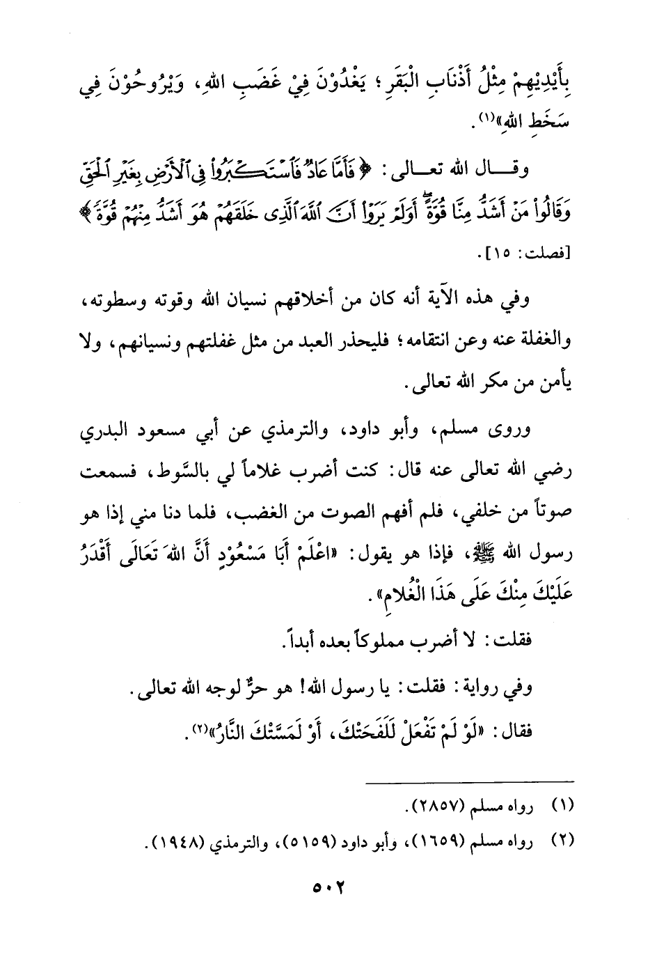 وروى مسلم، وأبو داود، والترمذي عن أبي مسعود البدري رضي الله تعالى عنه قال: كنت أضرب غلاماً لي بالسَّوط، فسمعت صوتاً من خلفي، فلم أفهم الصوت من الغضب، فلما دنا مني إذا هو رسول الله - صلى الله عليه وسلم -، فإذا هو يقول: "اعْلَمْ أَبَا مَسْعُوْدِ أَنَّ اللهَ تَعَالَى أَقْدَرُ عَلَيْكَ مِنْكَ عَلَى هَذَا الْغُلامِ".