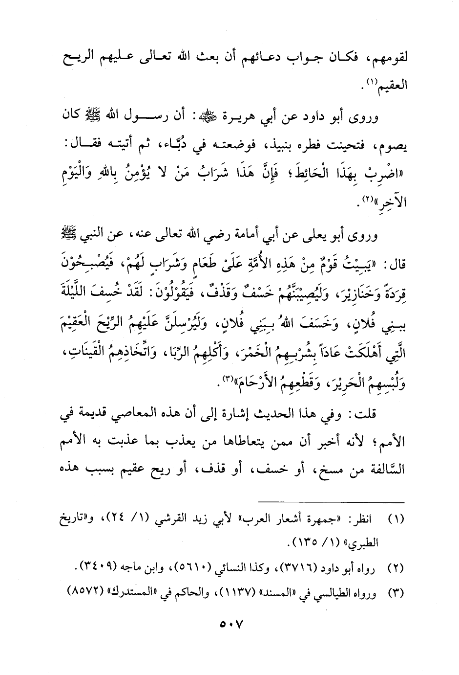 وروى أبو يعلى عن أبي أمامة رضي الله تعالى عنه، عن النبي - صلى الله عليه وسلم - قال: "يَبِيْتُ قَوْمٌ مِنْ هَذهِ الأُمَّةِ عَلَىْ طَعَامٍ وَشَرَابٍ لَهُمْ، فَيُصْبِحُوْنَ قِرَدَةً وَخَنَازيرَ، وَلَيُصِيْبَنَّهُمْ خَسْفٌ وَقَذْفٌ، فَيَقُوْلُوْنَ: لَقَدْ خُسِفَ اللَّيْلَةَ ببنِي فُلانٍ، وَخَسَفَ اللهُ بِبَنِي فُلانٍ، وَلَيُرْسِلَنَّ عَلَيْهِمُ الرِّيْحَ الْعَقِيْمَ الَّتِي أَهْلَكَتْ عَادًا بِشُرْبِهِمُ الْخَمْرَ، وَأَكْلِهِمُ الرِّبَا، وَاتّخَاذِهِمُ الْقَينَاتِ، وَلُبْسِهِمُ الْحَرِيْرَ، وَقَطْعِهِمُ الأَرْحَامَ" (¬3).