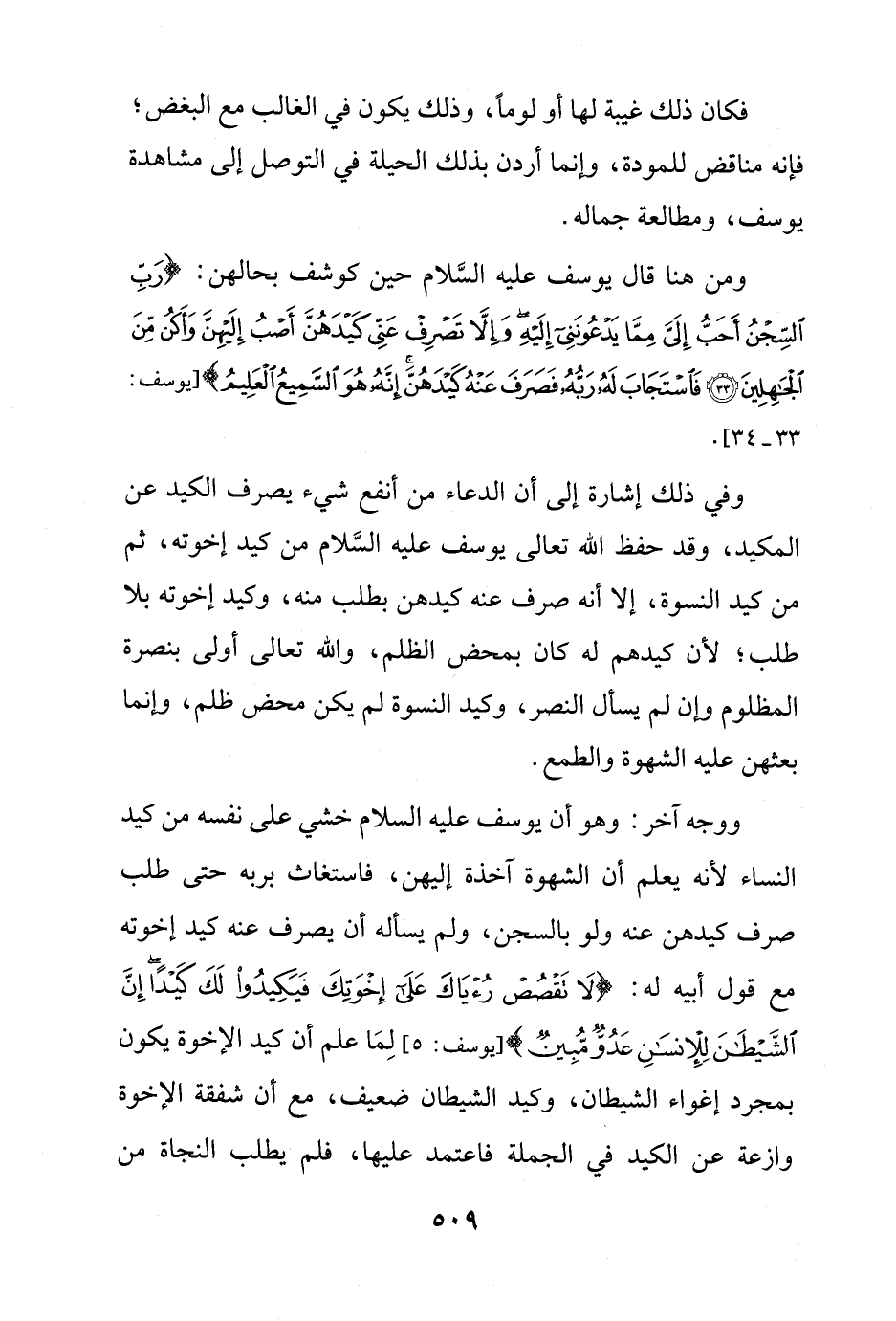 ووجه آخر: وهو أن يوسف عليه السلام خشي على نفسه من كيد النساء لأنه يعلم أن الشهوة آخذة إليهن، فاستغاث بربه حتى طلب صرف كيدهن عنه ولو بالسجن، ولم يسأله أن يصرف عنه كيد إخوته مع قول أبيه له: {لَا تَقْصُصْ رُؤْيَاكَ عَلَى إِخْوَتِكَ فَيَكِيدُوا لَكَ كَيْدًا إِنَّ الشَّيْطَانَ لِلْإِنْسَانِ عَدُوٌّ مُبِينٌ} [يوسف: 5] لِمَا علم أن كيد الإخوة يكون بمجرد إغواء الشيطان، وكيد الشيطان ضعيف، مع أن شفقة الإخوة وازعة عن الكيد في الجملة فاعتمد عليها، فلم يطلب النجاة من
