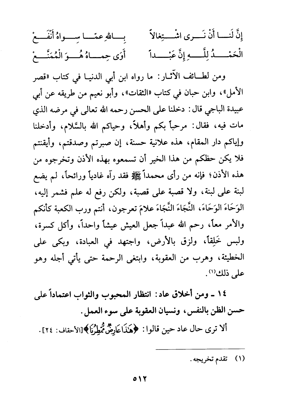 14 - ومن أخلاق عاد: انتظار المحبوب والثواب اعتماداً على حسن الظن بالنفس، ونسيان العقوبة على سوء العمل.