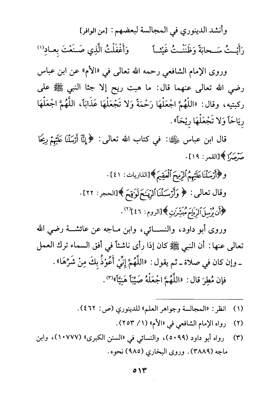 وروى الإمام الشافعي رحمه الله تعالى في "الأم" عن ابن عباس رضي الله تعالى عنهما قال: ما هبت ريح إلا جثا النبي - صلى الله عليه وسلم - على ركبتيه، وقال: "اللهُمَّ اجْعَلْهَا رَحْمَةً وَلا تَجْعَلْهَا عَذَابًا، اللَّهُمَّ اجْعَلْهَا رِياحًا وَلا تَجْعَلْهَا رِيْحًا".