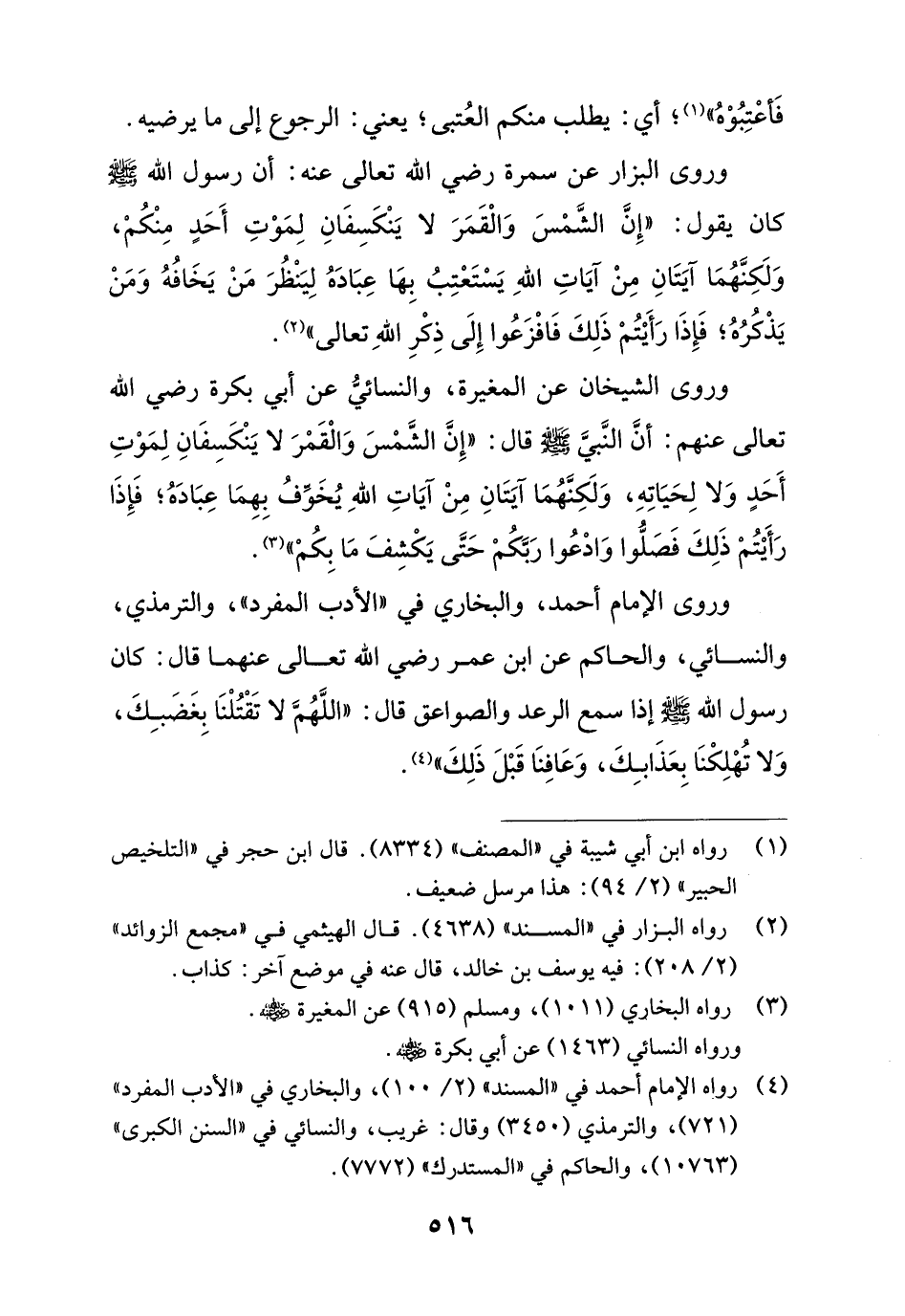 وروى البزار عن سمرة رضي الله تعالى عنه: أن رسول الله - صلى الله عليه وسلم - كان يقول: "إِنَّ الشَّمْسَ وَالْقَمَرَ لا يَنْكَسِفَانِ لِمَوْتِ أَحَدٍ مِنْكُمْ، وَلَكِنَّهُمَا آيَتَانِ مِنْ آيَاتِ اللهِ يَسْتَعْتِبُ بِهَا عِبَادَهُ لِيَنْظُرَ مَنْ يَخَافُهُ وَمَنْ يَذْكُرُهُ؛ فَإِذَا رَأَيْتُمْ ذَلِكَ فَافْزَعُوا إِلَى ذِكْرِ اللهِ تعالى" (¬2).