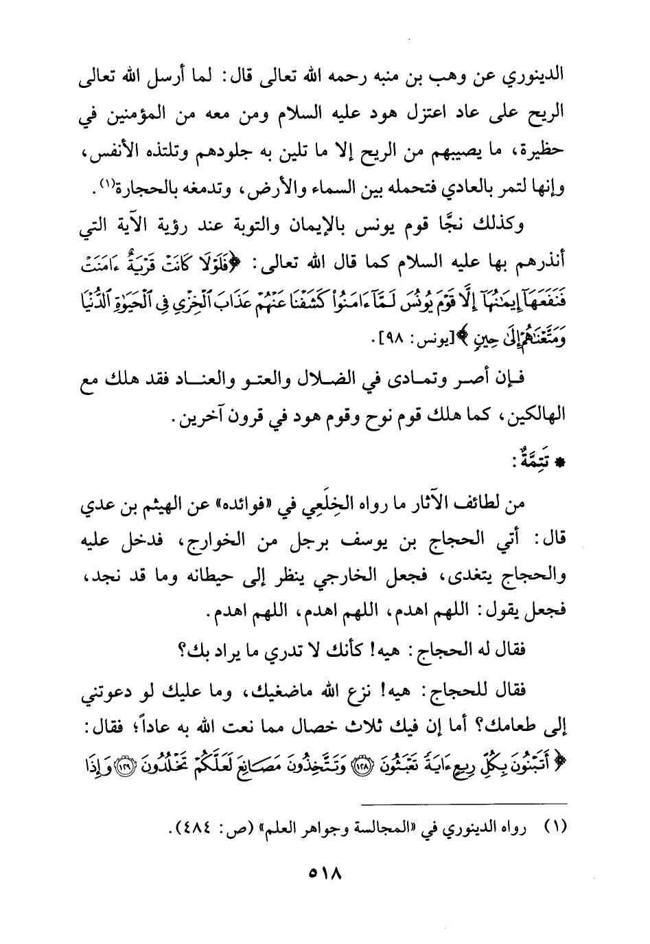 من لطائف الآثار ما رواه الخِلَعِي في "فوائده" عن الهيثم بن عدي قال: أتي الحجاج بن يوسف برجل من الخوارج، فدخل عليه والحجاج يتغدى، فجعل الخارجي ينظر إلى حيطانه وما قد نجد، فجعل يقول: اللهم اهدم، اللهم اهدم، اللهم اهدم.