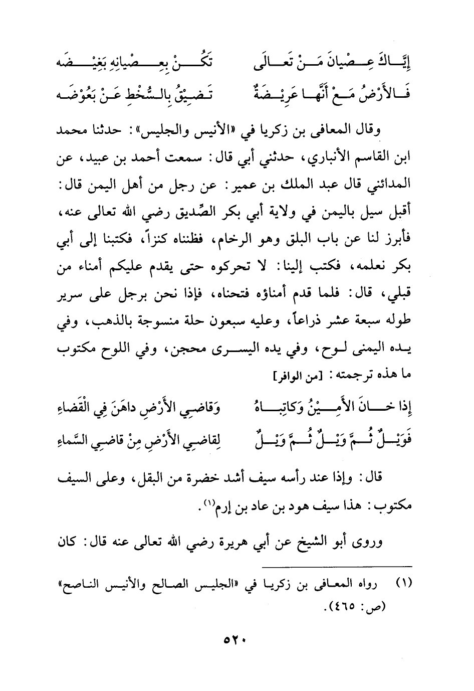 وقال المعافى بن زكريا في "الأنيس والجليس": حدثنا محمد ابن القاسم الأنباري، حدثني أبي قال: سمعت أحمد بن عبيد، عن المدائني قال عبد الملك بن عمير: عن رجل من أهل اليمن قال: أقبل سيل باليمن في ولاية أبي بكر الصديق رضي الله تعالى عنه، فأبرز لنا عن باب البلق وهو الرخام، فظنناه كنزاً، فكتبنا إلى أبي بكر نعلمه، فكتب إلينا: لا تحركوه حتى يقدم عليكم أمناء من قبلي، قال: فلما قدم أمناؤه فتحناه، فإذا نحن برجل على سرير طوله سبعة عشر ذراعاً، وعليه سبعون حلة منسوجة بالذهب، وفي يده اليمنى لوح، وفي يده اليسرى محجن، وفي اللوح مكتوب ما هذه ترجمته: [من الوافر]