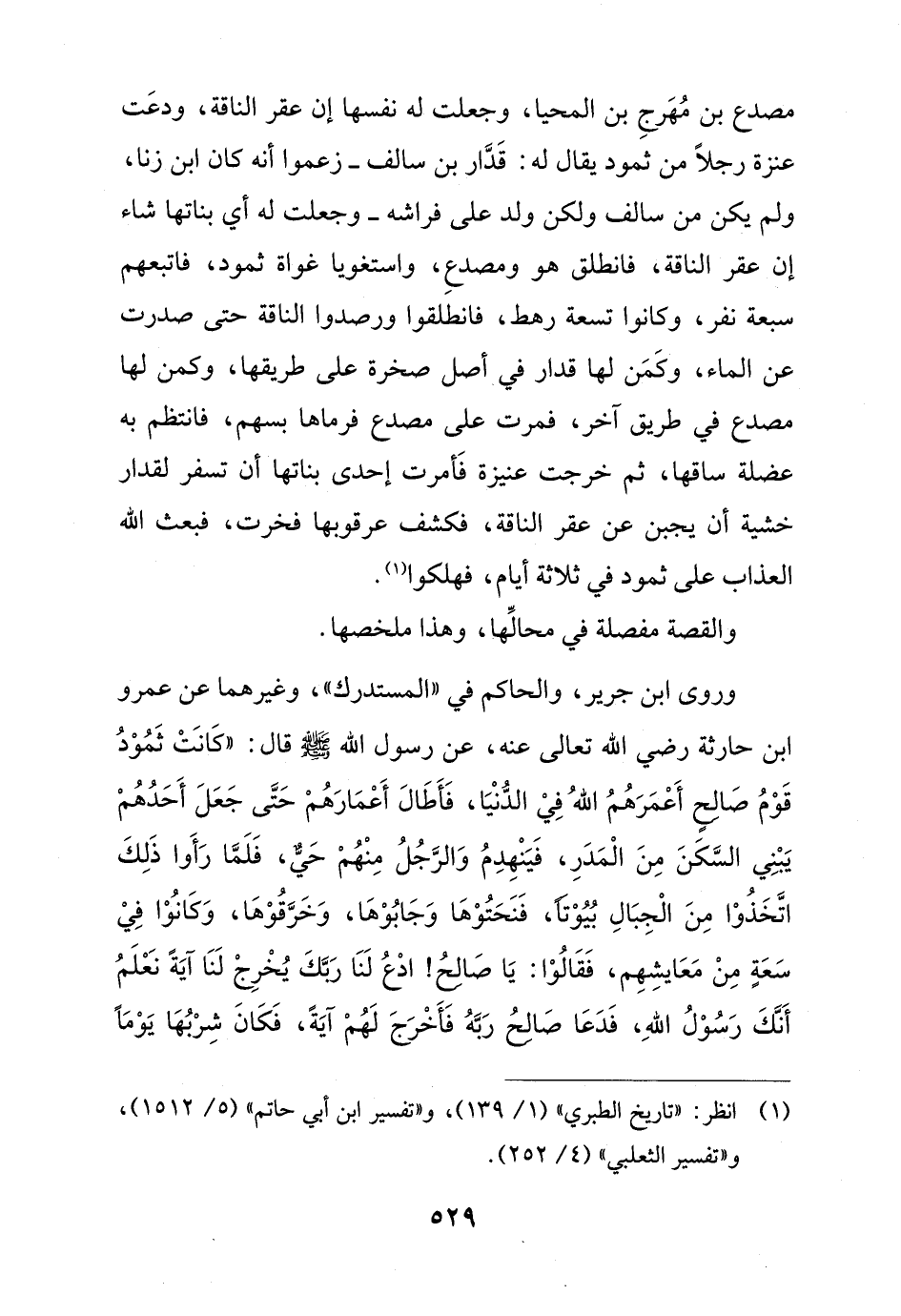 وروى ابن جرير، والحاكم في "المستدرك"، وغيرهما عن عمرو ابن حارثة رضي الله تعالى عنه، عن رسول الله - صلى الله عليه وسلم - قال: "كَانَتْ ثَمُوْدُ قَوْمُ صَالِحٍ أَعْمَرَهُمُ اللهُ فِيْ الدُّنْيَا، فَأَطَالَ أَعْمَارَهُمْ حَتَّى جَعَلَ أَحَدُهُمْ يَبْنِي السَّكَنَ مِنَ الْمَدَرِ، فَيَنْهِدِمُ وَالرَّجُلُ مِنْهُمْ حَيٌّ، فَلَمَّا رَأَوا ذَلِكَ اتَّخَذُوْا مِنَ الْجِبَالِ بُيُوْتاً، فَنَحَتُوْهَا وَجَابُوْهَا، وَخَرَّقُوْهَا، وَكَانُوْا فِيْ سَعَةٍ مِنْ مَعَايشِهِم، فَقَالُوْا: يَا صَالِحُ! ادْعُ لَنَا رَبَّكَ يُخْرِجْ لَنَا آيَةً نَعْلَمُ أَنَّكَ رَسُوْلُ اللهِ، فَدَعَا صَالِحُ رَبَّهُ فَأَخْرَجَ لَهُمْ آيَةً، فَكَانَ شِرْبُهَا يَوْمًا