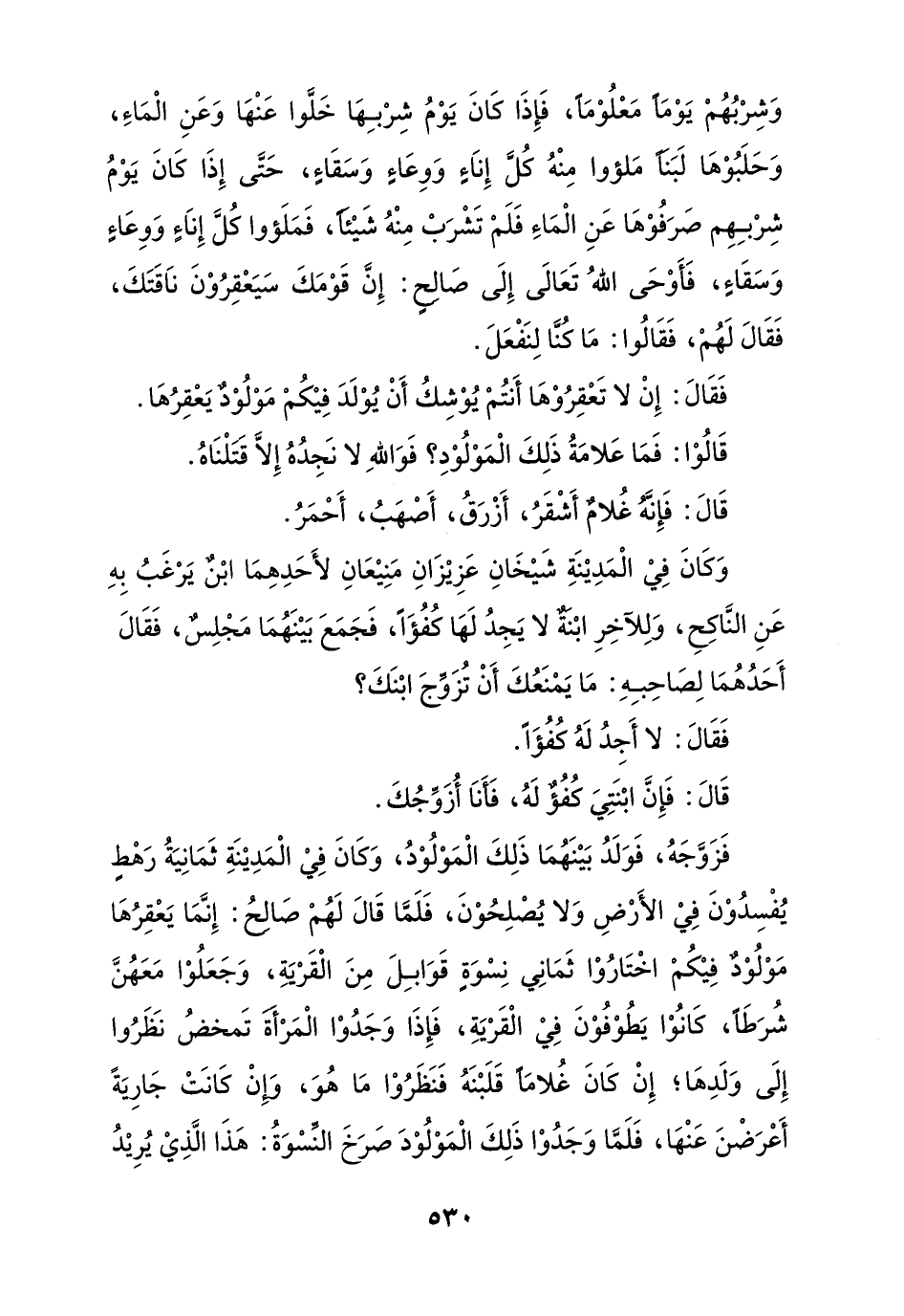 وَشِرْبُهُمْ يَوْمًا مَعْلُوْمًا، فَإِذَا كَانَ يَوْمُ شِرْبِهَا خَلَّوا عَنْهَا وَعَنِ الْمَاءِ، وَحَلَبُوْهَا لَبَناً مَلؤوا مِنْهُ كُل إِنَاءِ وَوِعَاءٍ وَسَقَاءٍ، حَتَّى إِذَا كَانَ يَوْمُ شِرْبِهِم صَرَفُوْهَا عَنِ الْمَاءِ فَلَمْ تَشْرَبْ مِنْهُ شَيْئاً، فَمَلَؤوا كُلَّ إِنَاءٍ وَوِعَاءٍ وَسَقَاءٍ، فَأَوْحَى اللهُ تَعَالَى إِلَى صَالِحٍ: إِنَّ قَوْمَكَ سَيَعْقِرُوْنَ ناَقَتَكَ، فَقَالَ لهُمْ، فَقَالُوا: مَا كُنَّا لِنَفْعَلَ.