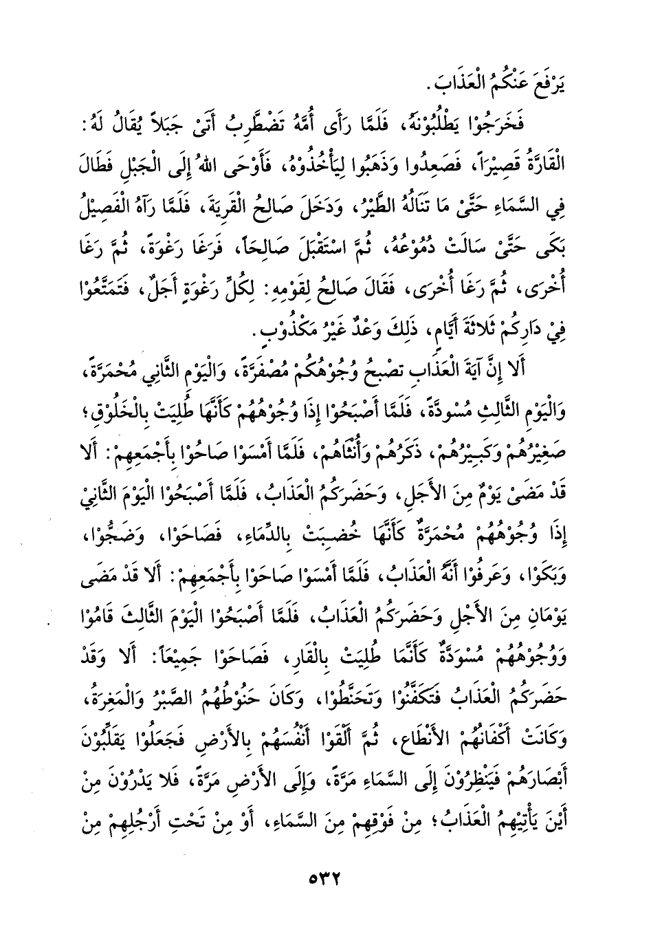 فَخَرَجُوْا يَطْلُبُوْنَهُ، فَلَمَّا رَأَى أُمَّهُ تَضْظَّرِبُ أتىْ جَبَلاً يُقَالُ لَهُ: الْقَارَّةُ قَصِيْرًا، فَصَعِدُوا وَذهبُوا لِيَأْخُذُوْهُ، فَأَوْحَى اللهُ إِلَى الْجَبْلِ فَطَالَ فِي السَّمَاءِ حَتَّىْ مَا تَنَالُهُ الطَّيْرُ، وَدَخَلَ صَالِحٍ الْقَرِيَةَ، فَلَمَّا رَآهُ الْفَصِيْلُ بَكَى حَتَّىْ سَألَتْ دُمُوْعُهُ، ثُمَّ اسْتَقْبَلَ صَالِحًا، فَرَغَا رَغْوَةً، ثُمَّ رَغَا أُخْرَى، ثُمَ رَغَا أُخْرَى، فَقَالَ صَالِحٍ لِقَوْمِهِ: لكُلِّ رَغْوَة أَجَلٌ، فَتَمَتَّعُوْا فِيْ دَارِكُمْ ثَلاثَةَ أَيَّامِ، ذَلِكَ وَعْدٌ غَيْرُ مَكْذُوْبٍ.