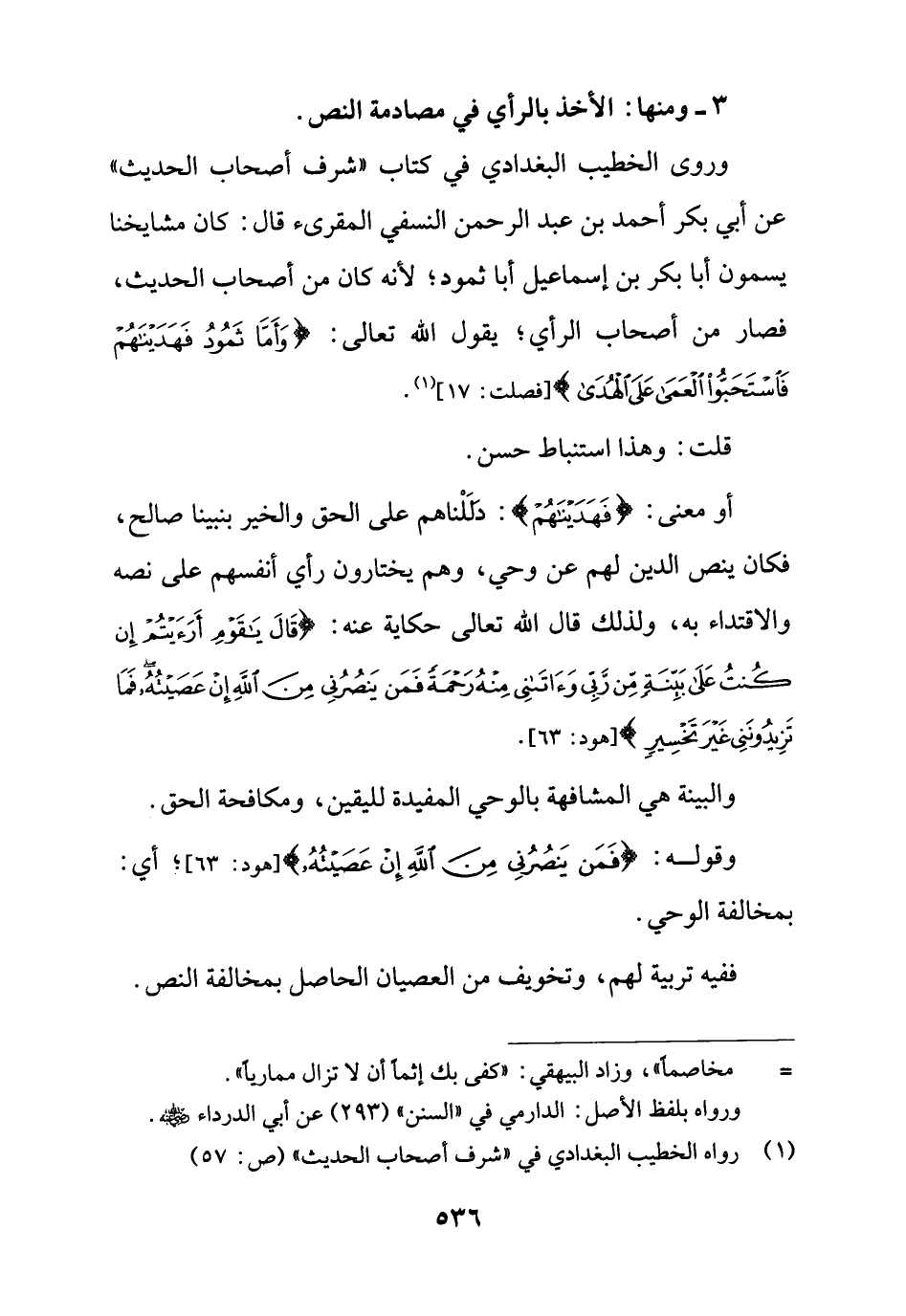 3 - ومنها: الأخذ بالرأي في مصادمة النص.