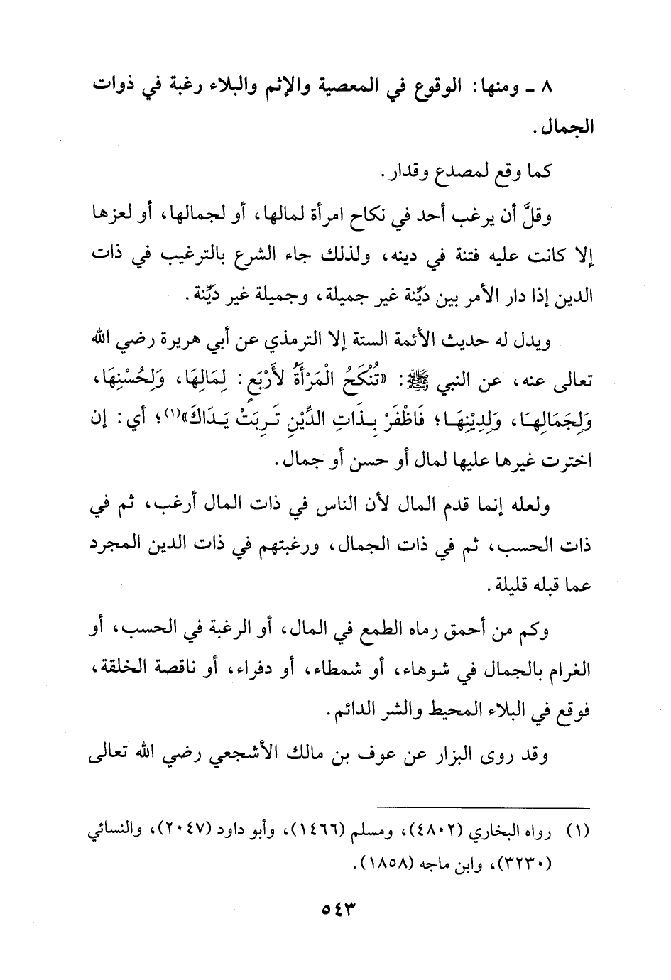 وقلَّ أن يرغب أحد في نكاح امرأة لمالها، أو لجمالها، أو لعزها إلا كانت عليه فتنة في دينه، ولذلك جاء الشرع بالترغيب في ذات الدين إذا دار الأمر بين دَيِّنة غير جميلة، وجميلة غير ديِّنة.