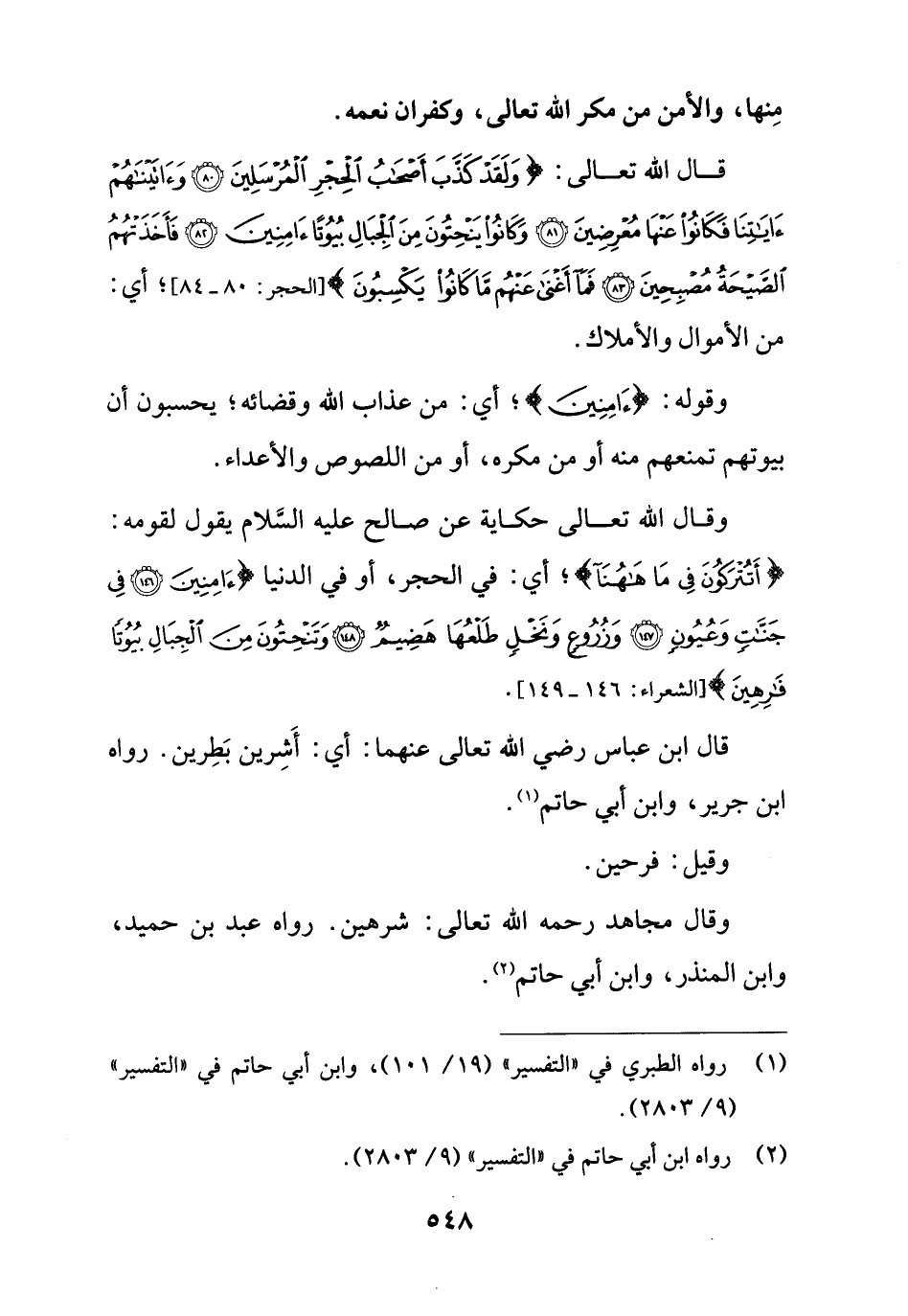 وقال الله تعالى حكاية عن صالح عليه السَّلام يقول لقومه: {أَتُتْرَكُونَ فِي مَا هَاهُنَا} [الشعراء: 146]؛ أي: في الحجر، أو في الدنيا {آمِنِينَ (146) فِي جَنَّاتٍ وَعُيُونٍ (147) وَزُرُوعٍ وَنَخْلٍ طَلْعُهَا هَضِيمٌ (148) وَتَنْحِتُونَ مِنَ الْجِبَالِ بُيُوتًا فَارِهِينَ (149)} [الشعراء: 146 - 149].