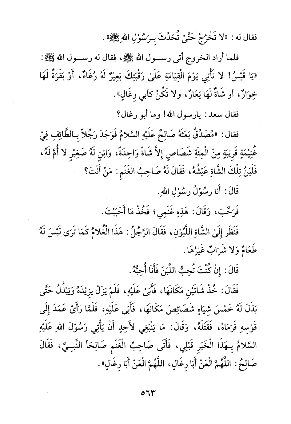فَقَالَ: خُذْ شَاتَيْنِ مَكَانها، فَأَبَىْ عَلَيْهِ، فَلَمْ يَزَلْ يزِيْدَهُ وَيَبْذُلُ حَتَّى بَذَلَ لَهُ خَمْسَ شِيَاهٍ شَصَائِصَ مَكَانها، فَأَبَى عَلَيْهِ، فَلَمَّا رَأَىْ عَمَدَ إِلَى قَوْسِهِ فَرَمَاهُ، فَقَتَلَهُ، وَقَالَ: مَا يَنْبَغِي لأَحِدٍ أَنْ يَأْتِي رَسُوْلَ اللهِ عَلَيْهِ السَّلامُ بِهَذَا الْخَبَرِ قَبْلِي، فَأَتَى صَاحِبُ الْغَنَمِ صَالِحًا النَّبِيَّ، فَقَالَ صَالِحُ: اللَّهُمَّ الْعَنْ أَبَا رِغَالٍ، اللَّهُمَّ الْعَنْ أَبَا رِغَالٍ".