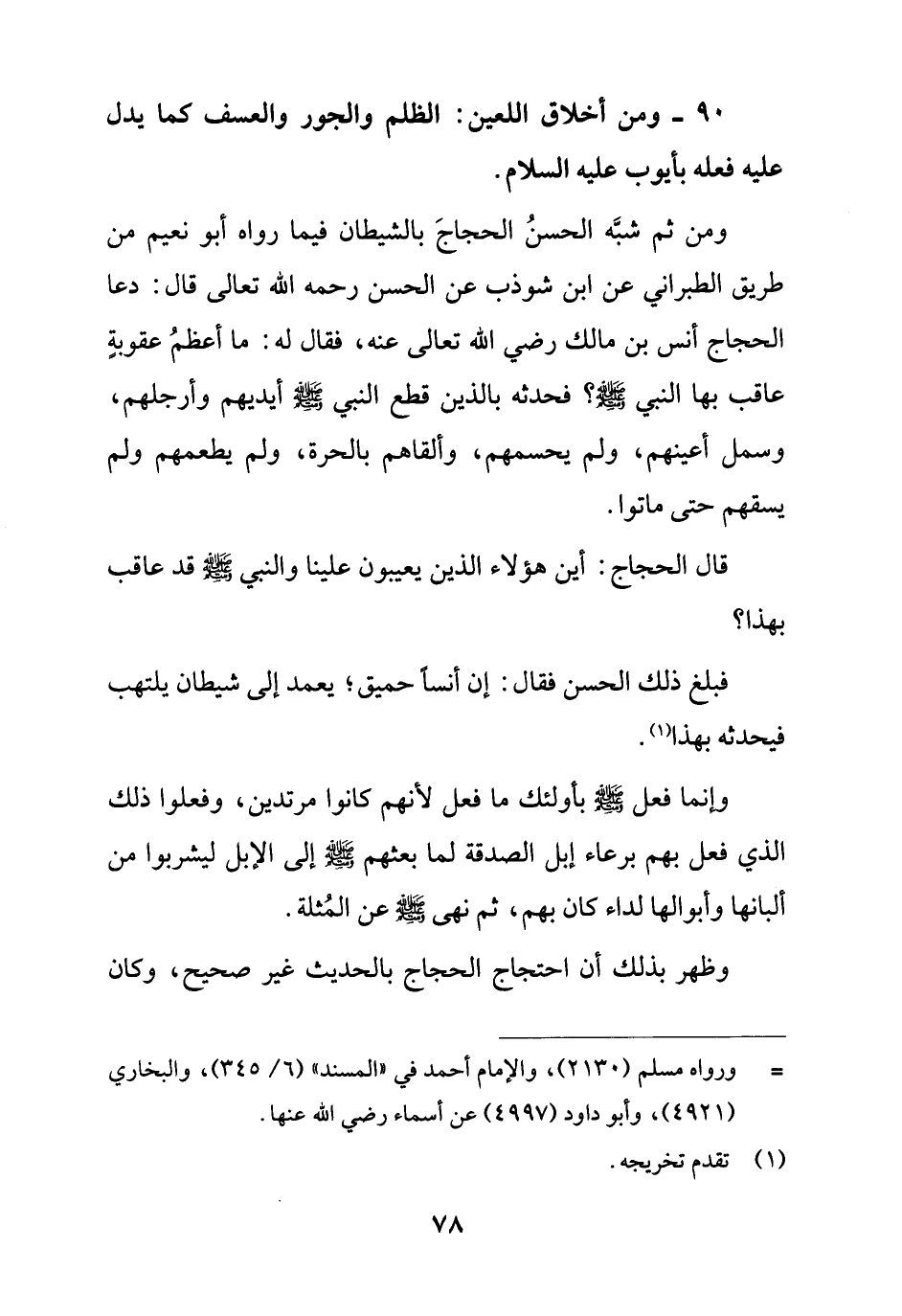 ومن ثم شبَّه الحسنُ الحجاجَ بالشيطان فيما رواه أبو نعيم من طريق الطبراني عن ابن شوذب عن الحسن رحمه الله تعالى قال: دعا الحجاج أنس بن مالك رضي الله تعالى عنه، فقال له: ما أعظمُ عقوبةٍ عاقب بها النبي - صلى الله عليه وسلم -؟ فحدثه بالذين قطع النبي - صلى الله عليه وسلم - أيديهم وأرجلهم، وسمل أعينهم، ولم يحسمهم، وألقاهم بالحرة، ولم يطعمهم ولم يسقهم حتى ماتوا.