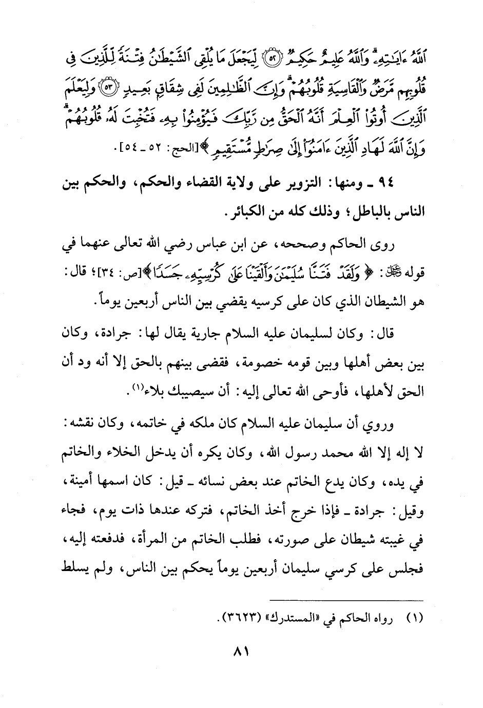 94 - ومنها: التزوير على ولاية القضاء والحكم، والحكم بين الناس بالباطل؛ وذلك كله من الكبائر.