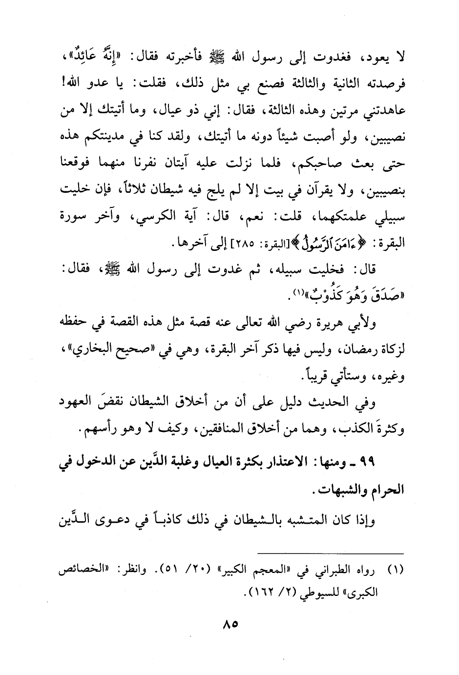 لا يعود، فغدوت إلى رسول الله - صلى الله عليه وسلم - فأخبرته فقال: "إِنَّهُ عَائدٌ"، فرصدته الثانية والثالثة فصنع بي مثل ذلك، فقلت: يا عدو الله! عاهدتني مرتين وهذه الثالثة، فقال: إني ذو عيال، وما أتيتك إلا من نصيبين، ولو أصبت شيئاً دونه ما أتيتك، ولقد كنا في مدينتكم هذه حتى بعث صاحبكم، فلما نزلت عليه آيتان نفرنا منهما فوقعنا بنصيبين، ولا يقرآن في بيت إلا لم يلج فيه شيطان ثلاثاً، فإن خليت سبيلي علمتكهما، قلت: نعم، قال: آية الكرسي، وآخر سورة البقرة: {آمَنَ الرَّسُولُ} [البقرة: 285] إلى آخرها.