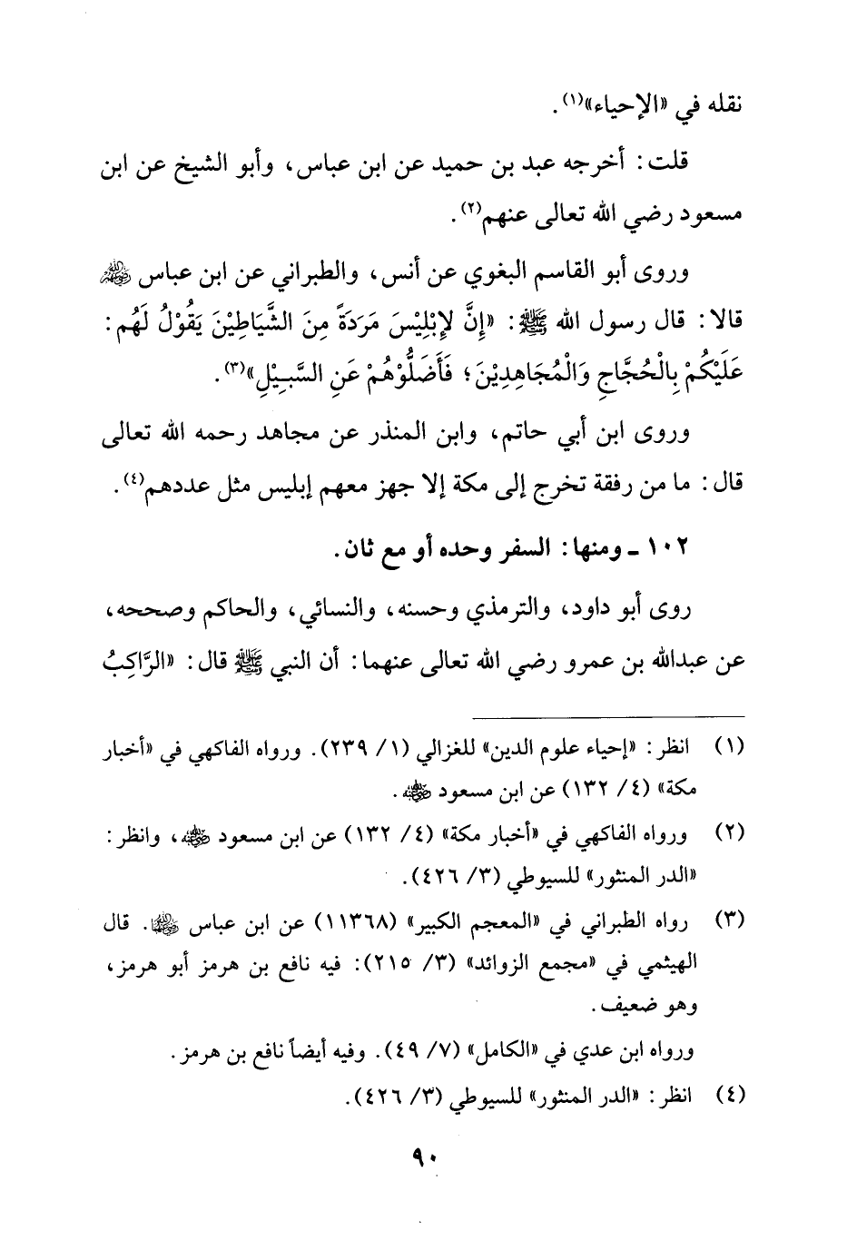 وروى أبو القاسم البغوي عن أنس، والطبراني عن ابن عباس - رضي الله عنهم - قالا: قال رسول الله - صلى الله عليه وسلم -: "إِنَّ لإِبْلِيْسَ مَرَدَةً مِنَ الشَّيَاطِيْنَ يَقُوْلُ لَهُم: عَلَيْكُمْ بِالْحُجَّاجِ وَالْمُجَاهِدِيْنَ؛ فَأَضَلُّوْهُمْ عَنِ السَّبِيْلِ" (¬3).