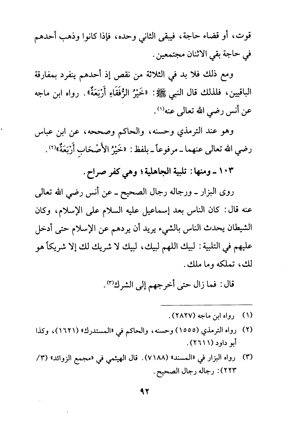 ومع ذلك فلا بد في الثلاثة من نقص إذ أحدهم ينفرد بمفارقة الباقيين، فلذلك قال النبي - صلى الله عليه وسلم -: "خَيْرُ الرُّفَقَاءِ أَرْبَعةٌ". رواه ابن ماجه عن أنس رضي الله تعالى عنه (¬1).