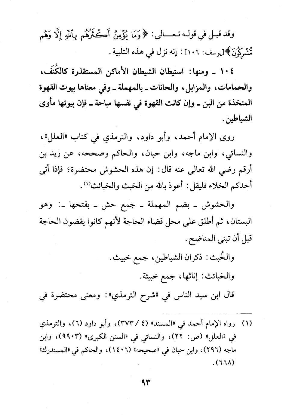 104 - ومنها: استيطان الشيطان الأمكن المستقذرة كالكُنَف، والحمامات، والمزابل، والحانات - بالمهملة - وفي معناها بيوت القهوة المتخذة من البن - وإن كانت القهوة في نفسها مباحة - فإن بيوتها مأوى الشياطين.