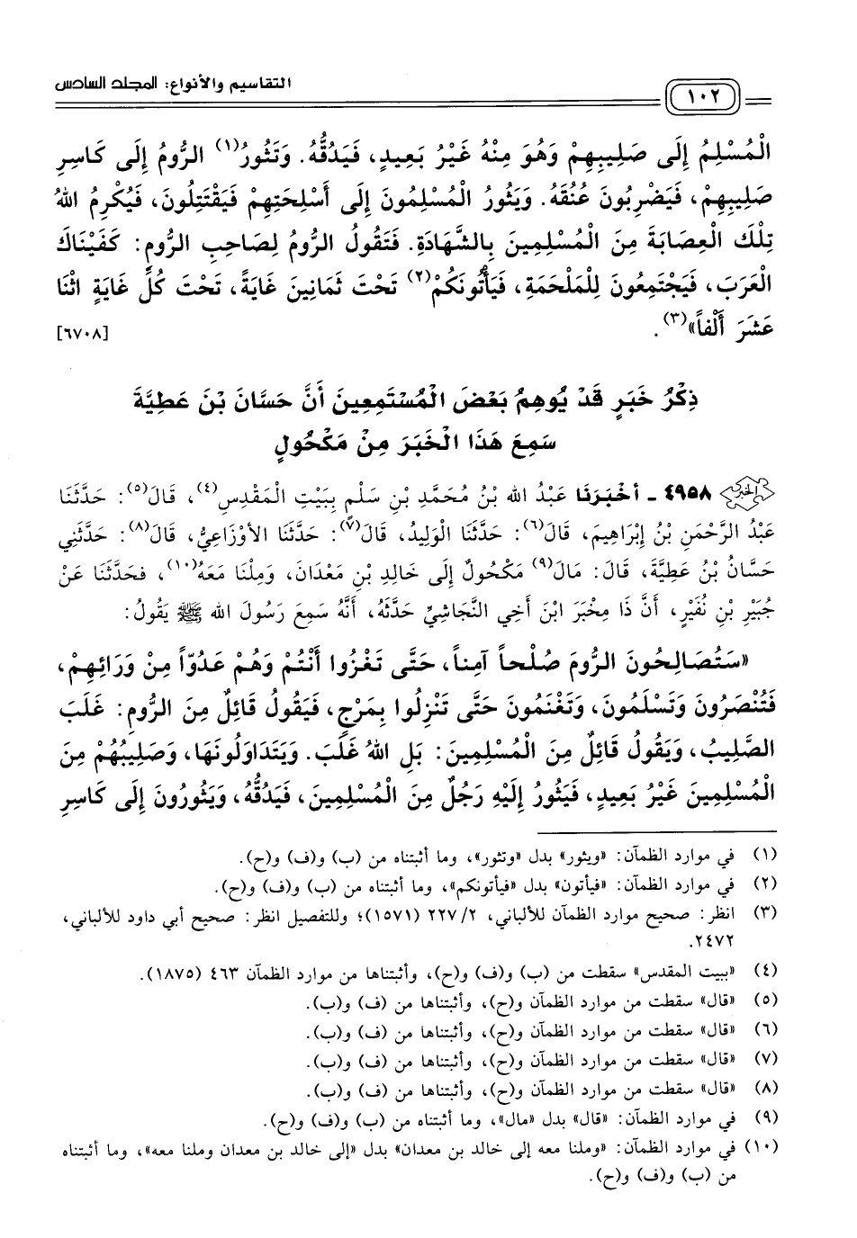 ٤٩٥٨ - أَخبَرنا عَبْدُ اللهِ بْنُ مُحَمَّدِ بْنِ سَلْمٍ ببيت المقدس، قَالَ: حَدثنا عَبْدُ الرَّحْمَنِ بْنُ إِبْرَاهِيمَ، قَالَ: حَدثنا الْوَلِيدُ، قَالَ: حَدثنا الأَوْزَاعِيُّ، قَالَ: حَدَّثَنِي حَسَّانُ بْنُ عَطِيَّةَ، قَالَ: مَالَ مَكْحُولٌ إِلَى خَالِدِ بْنِ مَعْدَانَ، وَمِلْنَا مَعَهُ، فَحَدثنا عَنْ جُبَيْرِ بْنِ نُفَيْرٍ، أَنَّ ذَا مِخْبَرِ ابْنَ أَخِي النَّجَاشِيِّ حَدَّثَهُ، أَنَّهُ سَمِعَ رَسُولَ اللهِ صَلى الله عَلَيه وسَلم يَقُولُ: "سَتُصَالِحُونَ الرُّومَ صُلْحًا آمِنًا، حَتَّى تَغْزُوا أَنْتُمْ وَهُمْ عَدُوًّا مِنْ وَرَائِهِمْ، فَتُنْصَرُونَ وَتَسْلَمُونَ وَتَغْنَمُونَ، حَتَّى تَنْزِلُوا بِمَرْجٍ، فَيَقُولُ قَائِلٌ مِنَ الرُّومِ: غَلَبَ الصَّلِيبُ، وَيَقُولُ قَائِلٌ مِنَ الْمُسْلِمِينَ: بَلِ اللهُ غَلَبَ، وَيَتَدَاوَلُونَهَا وَصَلِيبُهُمْ مِنَ الْمُسْلِمِينَ غَيْرُ بَعِيدٍ، فَيَثُورُ إِلَيْهِ رَجُلٌ مِنَ الْمُسْلِمِينَ فَيَدُقُّهُ، وَيَثُورُونَ إِلَى كَاسِرِ صَلِيبِهِمْ فَيَضْرِبُونَ عُنُقَهُ، وَيَثُورُ الْمُسْلِمُونَ إِلَى أَسْلِحَتِهِمْ فَيَقْتَتِلُونَ، فَيُكْرِمُ اللهُ تِلْكَ الْعِصَابَةَ بِالشَّهَادَةِ، فَيَأْتُونَ مَلِكَهُمْ فَيَقُولُونَ: كَفَيْنَاكَ جَزِيرَةَ الْعَرَبِ، فَيَجْتَمِعُونَ لِلْمَلْحَمَةِ، فَيَأْتُونَ تَحْتَ ثَمَانِينَ غَايَةً تَحْتَ كُلِّ غَايَةٍ اثْنَا عَشَرَ أَلْفًا". [٦٧٠٩]