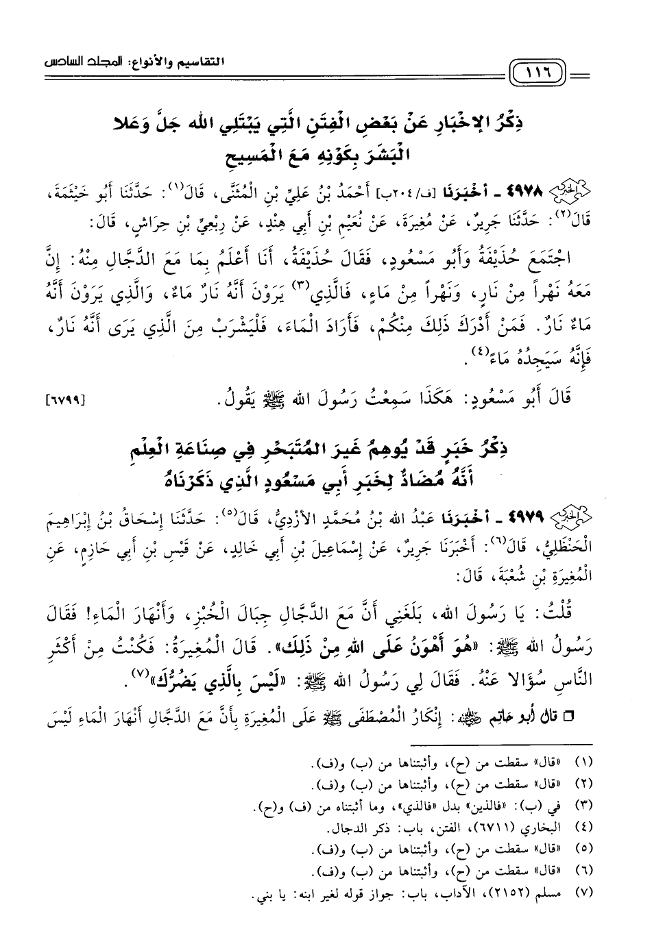 قَالَ أَبُو حَاتِمٍ رَضِيَ اللهُ عَنْهُ: إِنْكَارُ الْمُصْطَفَى صَلى الله عَلَيه وسَلم عَلَى الْمُغِيرَةِ بِأَنَّ مَعَ الدَّجَّالِ أَنْهَارَ الْمَاءِ لَيْسَ يُضَادُّ خَبَرَ أَبِي مَسْعُودٍ الَّذِي ذَكَرْنَاهُ، لأَنَّهُ أَهْوَنُ عَلَى اللهِ مِنْ أَنْ يَكُونَ مَعَهُ نَهْرُ الْمَاءِ يَجْرِي، وَالَّذِي مَعَهُ يُرَى أَنَّهُ مَاءٌ وَلَا مَاءَ، مِنْ غَيْرِ أَنْ يَكُونَ بَيْنَهُمَا تَضَادٌّ. [٦٨٠٠]
