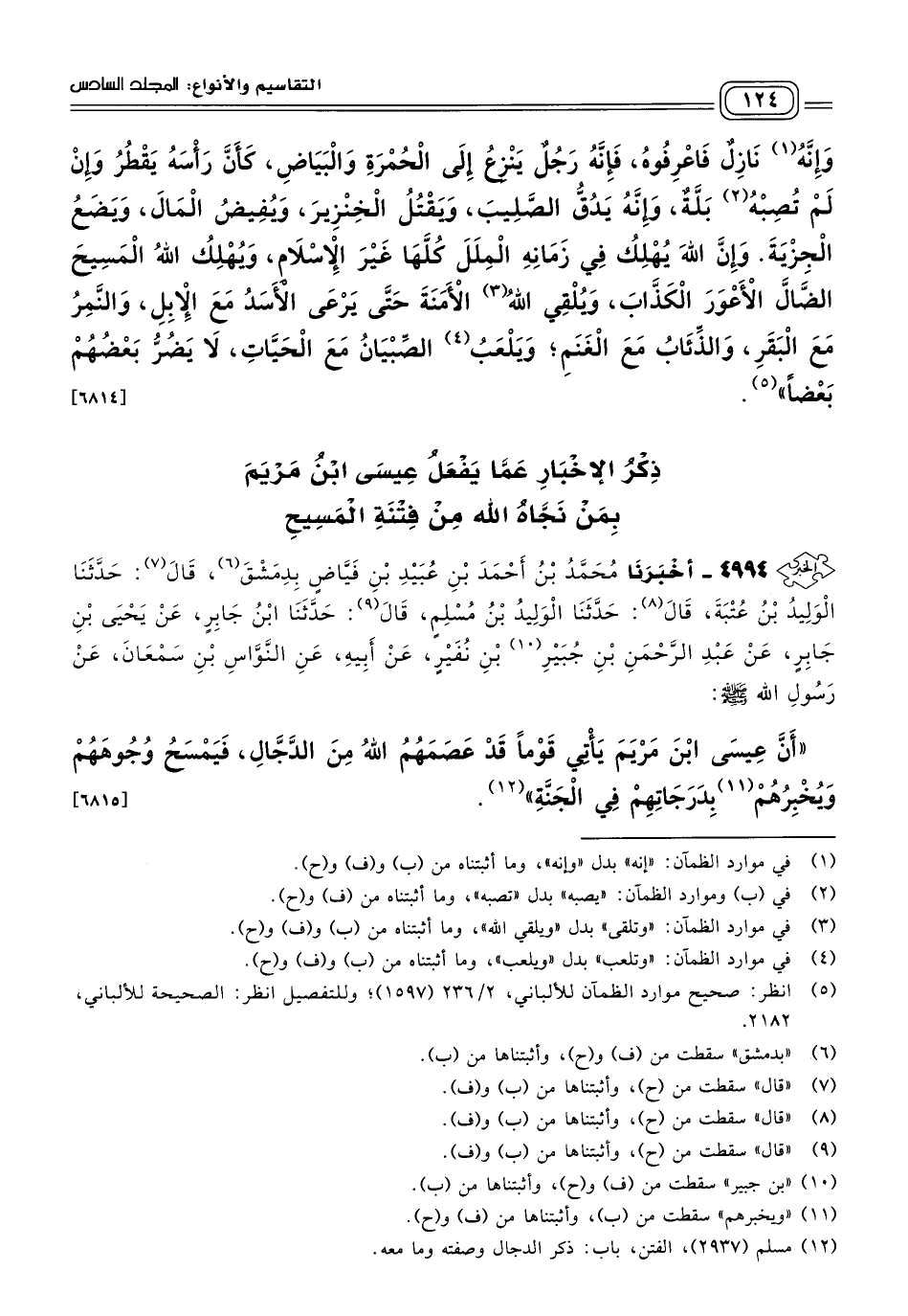 ٤٩٩٤ - أَخبَرنا مُحَمَّدُ بْنُ أَحْمَدَ بْنِ عُبَيْدِ بْنِ فَيَّاضٍ، بِدِمَشْقَ، قَالَ: حَدثنا الْوَلِيدُ بْنُ عُتْبَةَ، قَالَ: حَدثنا الْوَلِيدُ بْنُ مُسْلِمٍ، قَالَ: حَدثنا ابْنُ جَابِرٍ، عَنْ يَحْيَى بْنِ جَابِرٍ، عَنْ عَبْدِ الرَّحْمَنِ بْنِ جُبَيْرِ بْنِ نُفَيْرٍ، عَنْ أَبِيهِ، عَنِ النَّوَّاسِ بْنِ سَمْعَانَ، عَنِ رَسُولِ اللهِ صَلى الله عَلَيه وسَلم؛ "أَنَّ عِيسَى ابْنَ مَرْيَمَ يَأْتِي قَوْمًا قَدْ عَصَمَهُمُ اللهُ مِنَ الدَّجَّالِ، فَيَمْسَحُ وُجُوهَهُمْ ويخبرهم بِدَرَجَاتِهِمْ فِي الْجَنَّةِ". [٦٨١٥]