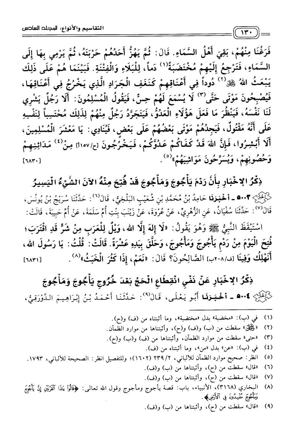 ٥٠٠٣ - أَخبَرنا حَامِدُ بْنُ مُحَمَّدِ بْنِ شُعَيْبٍ الْبَلْخِيُّ، قَالَ: حَدثنا سُرَيْجُ بْنُ يُونُسَ، قَالَ: حَدثنا سُفْيَانُ، عَنِ الزُّهْرِيِّ، عَنْ عُرْوَةَ، عَنْ زَيْنَبَ بِنْتِ أُمِّ سَلَمَةَ، عَنْ أُمِّ حَبِيبَةَ، قَالَتِ: اسْتَيْقَظَ النَّبِيُّ صَلى الله عَلَيه وسَلم وَهُوَ يَقُولُ: "لَا إِلَهَ إِلَاّ الله، وَيْلٌ لِلْعَرَبِ مِنْ شَرٍّ قَدِ اقْتَرَبَ، فُتِحَ الْيَوْمَ مِنْ رَدْمِ يَأْجُوجَ وَمَأْجُوجَ"، وَحَلَّقَ بِيَدِهِ عَشْرَةً، قالت: قُلْتُ: يَا رَسُولَ اللهِ، أَنَهْلِكُ وَفِينَا الصَّالِحُونَ؟ قَالَ: "نَعَمْ، إِذَا كَثُرَ الْخَبَثُ". [٦٨٣١]