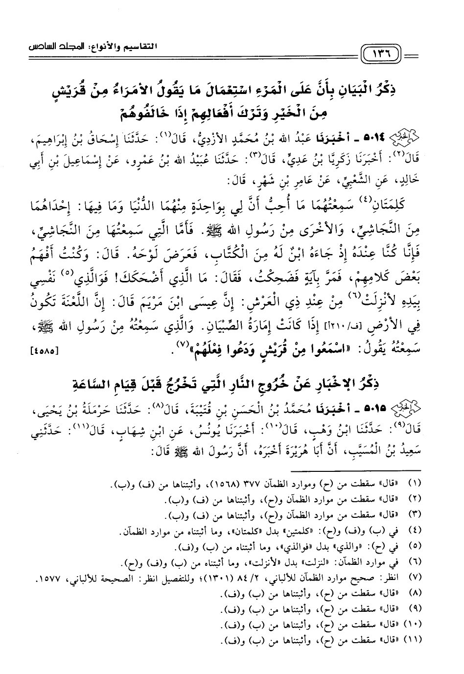 ٥٠١٤ - أَخبَرنا عَبْدُ اللهِ بْنُ مُحَمَّدٍ الأَزْدِيُّ، قَالَ: حَدثنا إِسْحَاقُ بْنُ إِبْرَاهِيمَ، قَالَ: أَخبَرنا زَكَرِيَّا بْنُ عَدِيٍّ، قَالَ: حَدثنا عُبَيْدُ اللهِ بْنُ عَمْرٍو، عَنْ إِسْمَاعِيلَ بْنِ أَبِي خَالِدٍ، عَنِ الشَّعْبِيِّ، عَنْ عَامِرِ بْنِ شَهْرٍ، قَالَ: كَلِمَتَانِ سَمِعْتُهُمَا مَا أُحِبُّ أَنْ لِي بِوَاحِدَةٍ مِنْهُمَا الدُّنْيَا وَمَا فِيهَا، إِحْدَاهُمَا مِنَ النَّجَاشِيِّ، وَالأُخْرَى مِنْ رَسُولِ اللهِ صَلى الله عَلَيه وسَلم، فَأَمَّا الَّتِي سَمِعْتُهَا مِنَ النَّجَاشِيِّ، فَإِنَّا كُنَّا عِنْدَهُ إِذْ جَاءَهُ ابْنٌ لَهُ مِنَ الْكُتَّابِ، فَعَرَضَ لَوْحَهُ، قَالَ: وَكُنْتُ أَفْهَمُ بَعْضَ كَلَامِهِمْ، فَمَرَّ بِآيَةٍ فَضَحِكْتُ، فَقَالَ: مَا الَّذِي أَضْحَكَكَ؟ فَوَالَّذِي نَفْسِي بِيَدِهِ، لأُنْزِلَتْ مِنْ عِنْدَ ذِي الْعَرْشِ إِنَّ عِيسَى ابْنَ مَرْيَمَ قَالَ: إِنَّ اللَّعْنَةَ تَكُونُ فِي الأَرْضِ إِذَا كَانَتْ إِمَارَةُ الصِّبْيَانِ، وَالَّذِي سَمِعْتُهُ مِنْ رَسُولِ اللهِ صَلى الله عَلَيه وسَلم، سَمِعْتُهُ يَقُولُ: "اسْمَعُوا مِنْ قُرَيْشٍ وَدَعُوا فِعْلَهُمْ". [٤٥٨٥]