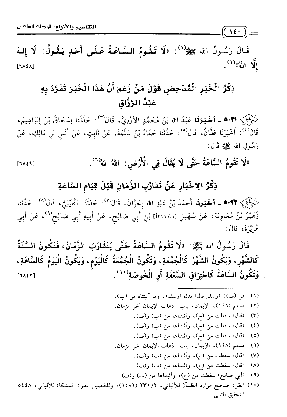 ٥٠٢٢ - أَخبَرنا أَحْمَدُ بْنُ عَبْدِ اللهِ بِحَرَّانَ، قَالَ: حَدثنا النُّفَيْلِيُّ، قَالَ: حَدثنا زُهَيْرُ بْنُ مُعَاوِيَةَ، عَنْ سُهَيْلِ بْنِ أَبِي صَالِحٍ، عَنْ أَبِيهِ أَبِي صَالِحٍ، عَنْ أَبِي هُرَيْرَةَ، قَالَ: قَالَ رَسُولُ اللهِ صَلى الله عَلَيه وسَلم: "لَا تَقُومُ السَّاعَةُ حَتَّى يَتَقَارَبَ الزَّمَانُ، فَتَكُونُ السَّنَةُ كَالشَّهْرِ، وَيَكُونُ الشَّهْرُ كَالْجُمُعَةِ، وَتَكُونُ الْجُمُعَةُ كَالْيَوْمِ، وَيَكُونُ الْيَوْمُ كَالسَّاعَةِ، وَتَكُونُ السَّاعَةُ كَاحْتِرَاقِ السَّعَفَةِ أَوِ الْخُوصَةِ". [٦٨٤٢]