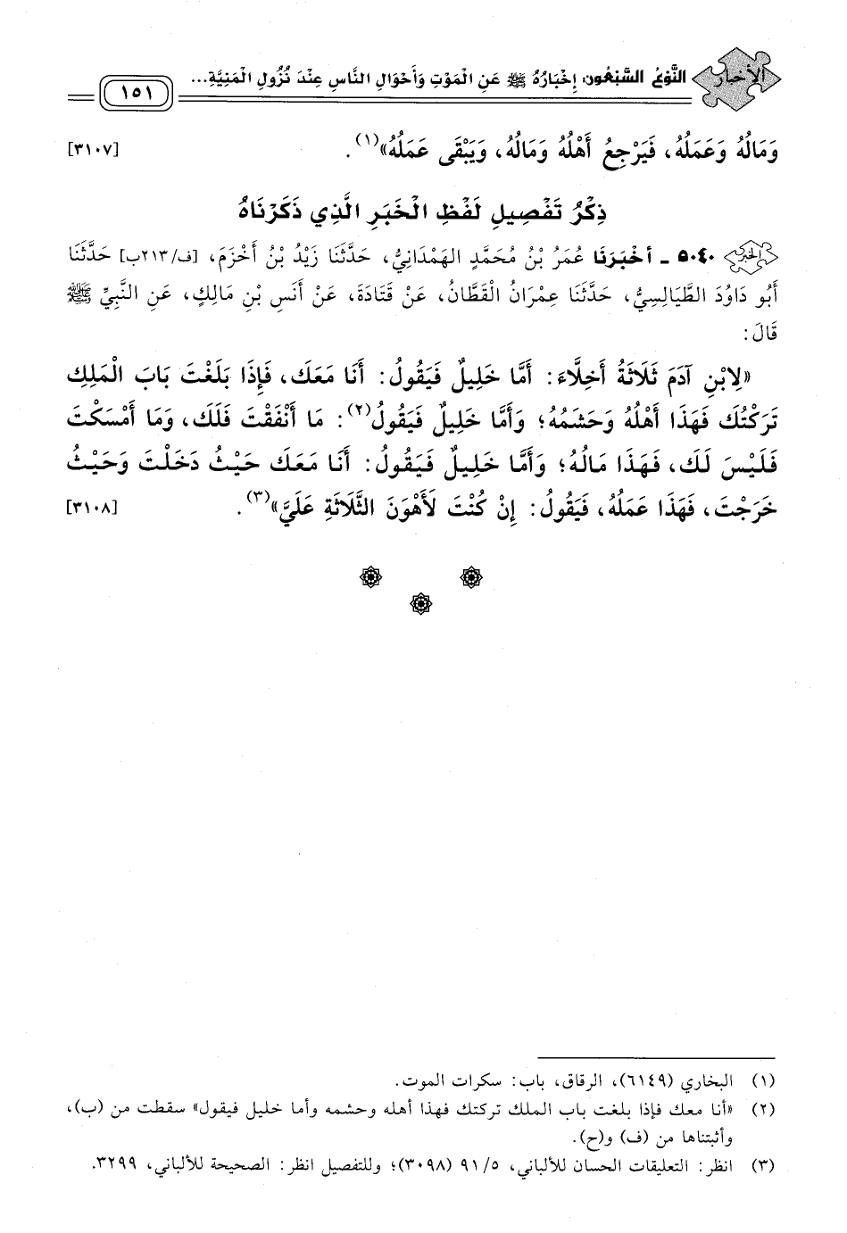 ٥٠٤٠ - أَخبَرنا عُمَرُ بْنُ مُحَمَّدٍ الْهَمْدَانِيُّ، حَدثنا زَيْدُ بْنُ أَخْزَمَ، حَدثنا أَبُو دَاوُدَ الطَّيَالِسِيُّ، حَدثنا عِمْرَانُ الْقَطَّانُ، عَنْ قَتَادَةَ، عَنِ أَنَسِ بْنِ مَالِكٍ، عَنِ النَّبِيِّ صَلى الله عَلَيه وسَلم قَالَ: "لاِبْنِ آدَمَ ثَلَاثَةُ أَخِلَاّءَ: أَمَّا خَلِيلٌ فَيَقُولُ: أَنَا مَعَكَ فَإِذَا بلغت بَابَ الْمَلِكِ تَرَكْتُكَ فهذا أَهْلُهُ وَحَشَمُهُ، وَأَمَّا خَلِيلٌ فَيَقُولُ: مَا أَنْفَقْتَ فَلَكَ، وَمَا أَمْسَكْتَ فَلَيْسَ لَكَ، فَهَذَا مَالُهُ، وَأَمَّا خَلِيلٌ فَيَقُولُ: أَنَا مَعَكَ حَيْثُ دَخَلْتَ وَحَيْثُ خَرَجْتَ، فَهَذَا عَمَلُهُ، فَيَقُولُ: إِنْ كُنْتَ لأَهْوَنَ الثَّلَاثَةِ عَلَيَّ". [٣١٠٨]