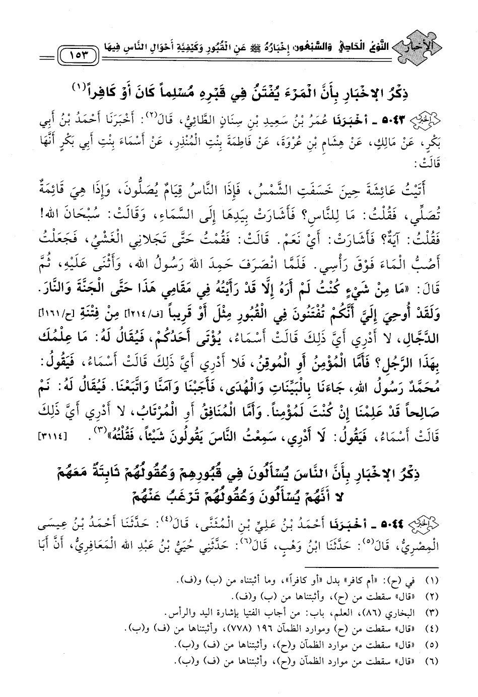 ٥٠٤٣ - أَخْبَرَنَا عُمَرُ بْنُ سَعِيدِ بْنِ سِنَانٍ الطَّائِيُّ، قَالَ: أَخْبَرَنَا أَحْمَدُ بْنُ أَبِي بَكْرٍ، عَنْ مَالِكٍ، عَنْ هِشَامِ بْنِ عُرْوَةَ، عَنْ فَاطِمَةَ بِنْتِ الْمُنْذِرِ، عَنْ أَسْمَاءَ بِنْتِ أَبِي بَكْرٍ، أَنَّهَا قَالَتْ: أَتَيْتُ عَائِشَةَ حِينَ خَسَفَتِ الشَّمْسُ، فَإِذَا النَّاسُ قِيَامٌ يُصَلُّونَ، وَإِذَا هِيَ قَائِمَةٌ تُصَلِّي، فَقُلْتُ: مَا لِلنَّاسِ؟ فَأَشَارَتْ بِيَدِهَا إِلَى السَّمَاءِ، وَقَالَتْ: سُبْحَانَ اللهِ، فَقُلْتُ: آيَةٌ؟ فَأَشَارَتْ: أَيْ نَعَمْ، قَالَتْ: فَقُمْتُ حَتَّى تَجَلَاّنِي الْغَشْيُ، فَجَعَلْتُ أُصُبُّ الْمَاءَ فَوْقَ رَأْسِي، فَلَمَّا انْصَرَفَ حَمِدَ اللَّهَ رَسُولُ اللهِ، وَأَثْنَى عَلَيْهِ، ثُمَّ قَالَ: "مَا مِنْ شَيْءٍ كُنْتُ لَمْ أَرَهُ إِلَاّ قَدْ رَأَيْتُهُ فِي مَقَامِي هَذَا حَتَّى الْجَنَّةَ وَالنَّارَ، وَلَقَدْ أُوحِيَ إِلَيَّ أَنَّكُمْ تُفْتَنُونَ فِي الْقُبُورِ مِثْلَ أَوْ قَرِيبًا مِنْ فِتْنَةِ الدَّجَّالِ- لَا أَدْرِي أَيَّ ذَلِكَ قَالَتْ أَسْمَاءُ- يُؤْتَى أَحَدُكُمْ، فَيُقَالُ لَهُ: مَا عِلْمُكَ بِهَذَا الرَّجُلِ؟ فَأَمَّا الْمُؤْمِنُ أَوِ الْمُوقِنُ- فَلَا أَدْرِي أَيَّ ذَلِكَ قَالَتْ أَسْمَاءُ- فَيَقُولُ: مُحَمَّدٌ رَسُولُ اللهِ جَاءَنَا بِالْبَيِّنَاتِ وَالْهُدَى، فَأَجَبْنَا وَآمَنَّا وَاتَّبَعْنَا، فَيُقَالُ لَهُ: نَمْ صَالِحًا قَدْ عَلِمْنَا إِنْ كُنْتَ لَمُؤْمِنًا، وَأَمَّا الْمُنَافِقُ أَوِ الْمُرْتَابُ- لَا أَدْرِي أَيَّ ذَلِكَ قَالَتْ أَسْمَاءُ- فَيَقُولُ: لَا أَدْرِي، سَمِعْتُ النَّاسَ يَقُولُونَ شَيْئًا فَقُلْتُهُ". [٣١١٤]