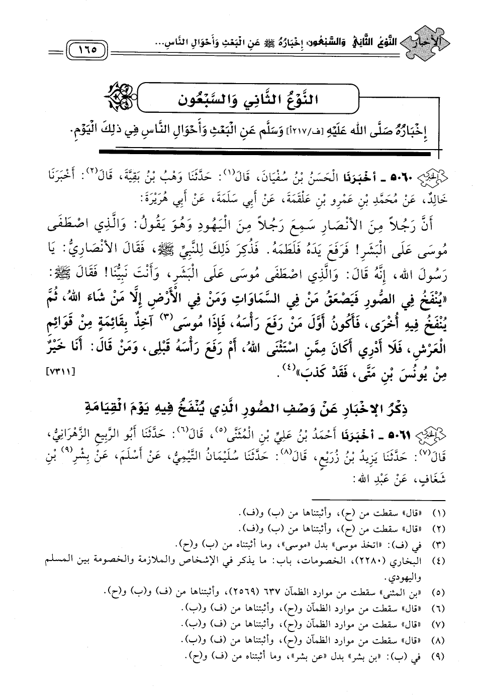٥٠٦٠ - أَخبَرنا الْحَسَنُ بْنُ سُفْيَانَ، قَالَ: حَدثنا وَهْبُ بْنُ بَقِيَّةَ، قَالَ: أَخبَرنا خَالِدٌ، عَنْ مُحَمَّدِ بْنِ عَمْرِو بْنِ عَلْقَمَةَ، عَنْ أَبِي سَلَمَةَ، عَنْ أَبِي هُرَيْرَةَ، أَنَّ رَجُلاً مِنَ الأَنْصَارِ سَمِعَ رَجُلاً مِنَ الْيَهُودِ وَهُوَ يَقُولُ: وَالَّذِي اصْطَفَى مُوسَى عَلَى الْبَشَرِ، فَرَفَعَ يَدَهُ فَلَطَمَهُ، فَذُكِرَ ذَلِكَ لِلنَّبِيِّ صَلى الله عَلَيه وسَلم، فَقَالَ الأَنْصَارِيُّ: يَا رَسُولَ اللهِ، إِنَّهُ قَالَ: وَالَّذِي اصْطَفَى مُوسَى عَلَى الْبَشَرِ، وَأَنْتَ نَبِيُّنَا، فَقَالَ صَلى الله عَلَيه وسَلم: "يُنْفَخُ فِي الصُّورِ، فَيَصْعَقُ مَنْ فِي السَّمَاوَاتِ وَمَنْ فِي الأَرْضِ إِلَاّ مِنْ شَاءَ اللهُ، ثُمَّ يُنْفَخُ فِيهِ أُخْرَى، فَأَكُونُ أَوَّلَ مَنْ رَفَعَ رَأْسَهُ، فَإِذَا مُوسَى آخِذٌ بِقَائِمَةٍ مِنْ قَوَائِمِ الْعَرْشِ، فَلَا أَدْرِي أَكَانَ مِمَّنِ اسْتَثْنَى اللهُ أَمْ رَفَعَ رَأْسَهُ قَبْلِي، وَمَنْ قَالَ: أَنَا خَيْرٌ مِنْ يُونُسَ بْنِ مَتَّى فَقَدْ كَذَبَ". [٧٣١١]