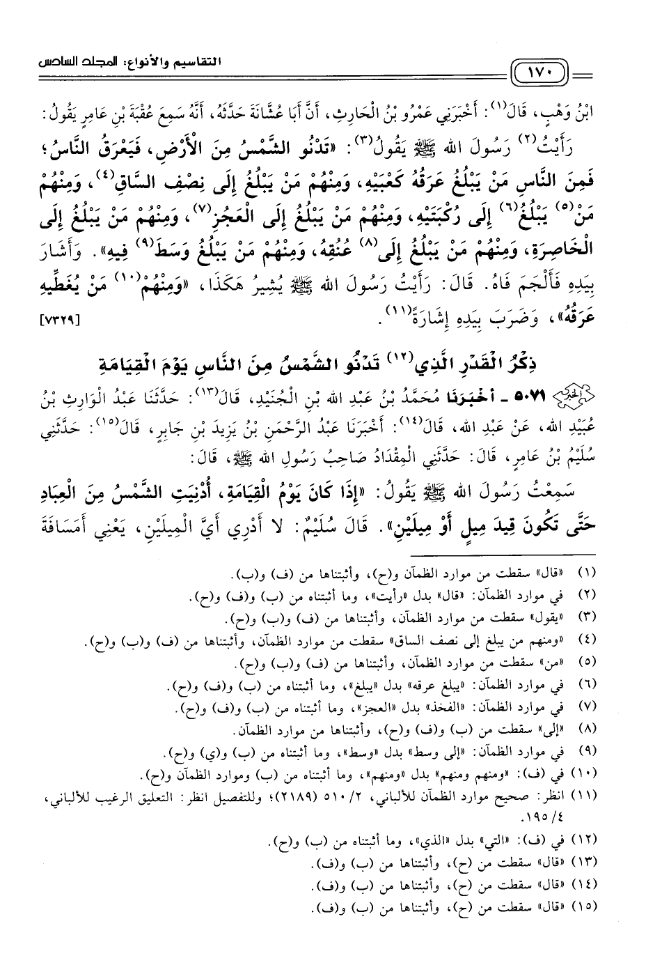 ٥٠٧١ - أَخبَرنا مُحَمَّدُ بْنُ عَبْدِ اللهِ بْنِ الْجُنَيْدِ، قَالَ: حَدثنا عَبْدُ الْوَارِثِ بْنُ عُبَيْدِ اللهِ، عَنْ عَبْدِ اللهِ، قَالَ: أَخبَرنا عَبْدُ الرَّحْمَنِ بْنُ يَزِيدَ بْنِ جَابِرٍ، قَالَ: حَدَّثَنِي سُلَيْمُ بْنُ عَامِرٍ، قَالَ: حَدَّثَنِي الْمِقْدَادُ صَاحِبُ رَسُولِ اللهِ صَلى الله عَلَيه وسَلم، قَالَ: سَمِعْتُ رَسُولَ اللهِ صَلى الله عَلَيه وسَلم يَقُولُ: "إِذَا كَانَ يَوْمُ الْقِيَامَةِ أُدْنِيَتِ الشَّمْسُ مِنَ الْعِبَادِ حَتَّى تَكُونَ قِيدَ مِيلٍ أَوْ مِيلَيْنِ"، قَالَ سُلَيْمٌ: لَا أَدْرِي أَيَّ الْمِيلَيْنِ، يَعْنِي أَمَسَافَةَ الأَرْضِ أَمْ مِيلا الَّذِي تُكْتَحَلُ بِهِ الْعَيْنُ. قَالَ: "فَتَصْهَرُهُمُ الشَّمْسُ، فَيَكُونُونَ فِي الْعَرَقِ كَقَدْرِ أَعْمَالِهِمْ، فَمِنْهُمْ مَنْ يَأْخُذُهُ إِلَى عَقِبَيْهِ، وَمِنْهُمْ مَنْ يَأْخُذُهُ إِلَى رُكْبَتَيْهِ، وَمِنْهُمْ مَنْ يَأْخُذُهُ إِلَى حَقْوَيْهِ، وَمِنْهُمْ مَنْ يُلْجِمُهُ إِلْجَامًا"، قَالَ: فَرَأَيْتُ رَسُولَ اللهِ صَلى الله عَلَيه وسَلم وَهُوَ يُشِيرُ بِيَدِهِ إِلَى فِيهِ، يَقُولُ: "يُلْجِمُهُمْ إِلْجَامًا". [٧٣٣٠]
