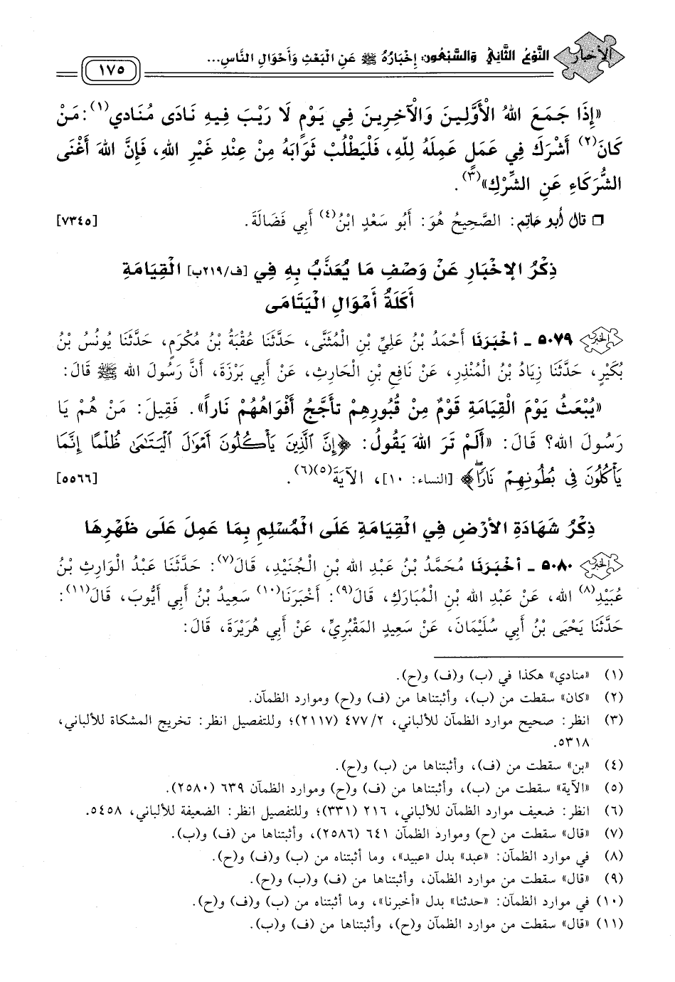 ٥٠٨٠ - أَخبَرنا مُحَمَّدُ بْنُ عَبْدِ اللهِ بْنِ الْجُنَيْدِ، قَالَ: حَدثنا عَبْدُ الْوَارِثِ بْنُ عُبَيْدِ اللهِ، عَنْ عَبْدِ اللهِ بْنِ الْمُبَارَكِ، قَالَ: أَخبَرنا سَعِيدُ بْنُ أَبِي أَيُّوبَ، قَالَ: حَدثنا يَحْيَى بْنُ أَبِي سُلَيْمَانَ، عَنْ سَعِيدٍ الْمَقْبُرِيِّ، عَنْ أَبِي هُرَيْرَةَ، قَالَ: قَرَأَ رَسُولُ اللهِ صَلى الله عَلَيه وسَلم هَذِهِ الآيَةَ: {يَوْمَئِذٍ تُحَدِّثُ أَخْبَارَهَا} [الزلزلة: ٤]، قَالَ: "أَتَدْرُونَ مَا أَخْبَارُهَا؟ " قَالُوا: اللهُ وَرَسُولُهُ أَعْلَمُ، قَالَ: "فَإِنَّ أَخْبَارَهَا أَنْ تَشْهَدَ عَلَى كُلِّ عَبْدٍ وَأَمَةٍ بِمَا عَمِلَ عَلَى ظَهْرِهَا أَنْ تَقُولَ: عَمِلَ كَذَا وَكَذَا فِي يَوْمِ كَذَا وَكَذَا، فَهَذِهِ أَخْبَارُهَا". [٧٣٦٠]