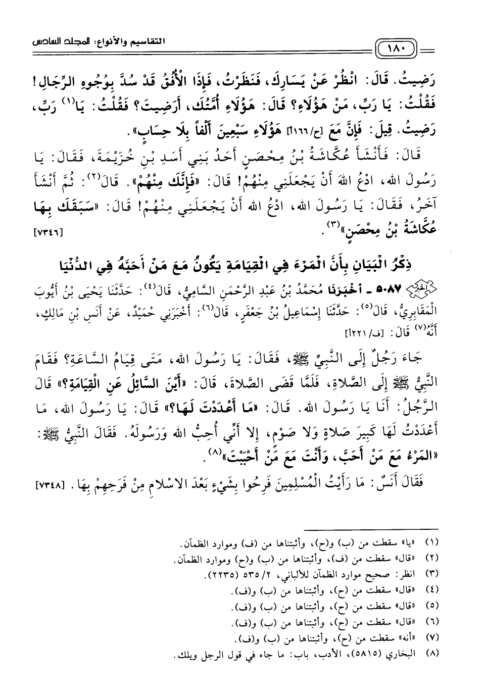 ٥٠٨٧ - أَخبَرنا مُحَمَّدُ بْنُ عَبْدِ الرَّحْمَنِ السَّامِيُّ، قَالَ: حَدثنا يَحْيَى بْنُ أَيُّوبَ الْمَقَابِرِيُّ، قَالَ: حَدثنا إِسْمَاعِيلُ بْنُ جَعْفَرٍ، قَالَ: أَخْبَرَنِي حُمَيْدٌ، عَنْ أَنَسِ بْنِ مَالِكٍ، أَنَّهُ قَالَ: جَاءَ رَجُلٌ إِلَى النَّبِيِّ صَلى الله عَلَيه وسَلم، فَقَالَ: يَا رَسُولَ اللهِ، مَتَى قِيَامُ السَّاعَةِ؟ فَقَامَ النَّبِيُّ صَلى الله عَلَيه وسَلم إِلَى الصَّلَاةِ، فَلَمَّا قَضَى الصَّلَاةَ، قَالَ: "أَيْنَ السَّائِلُ عَنِ الْقِيَامَةِ؟ " قَالَ الرَّجُلُ: أَنَا يَا رَسُولَ اللهِ، قَالَ: "مَا أَعْدَدْتَ لَهَا؟ " قَالَ: يَا رَسُولَ اللهِ، مَا أَعْدَدْتُ لَهَا كَبِيرَ صَلَاةٍ وَلَا صَوْمٍ، إِلَاّ أَنِّي أُحِبُّ اللهَ وَرَسُولَهُ، فَقَالَ النَّبِيُّ صَلى الله عَلَيه وسَلم: "الْمَرْءُ مَعَ مَنْ أَحَبَّ، وَأَنْتَ مَعَ مَنْ أَحْبَبْتَ"، فَقَالَ أَنَسٌ: مَا رَأَيْتُ الْمُسْلِمِينَ فَرِحُوا بِشَيْءٍ بَعْدَ الإِسْلَامِ من فَرَحِهِمْ بِهَا. [٧٣٤٨]