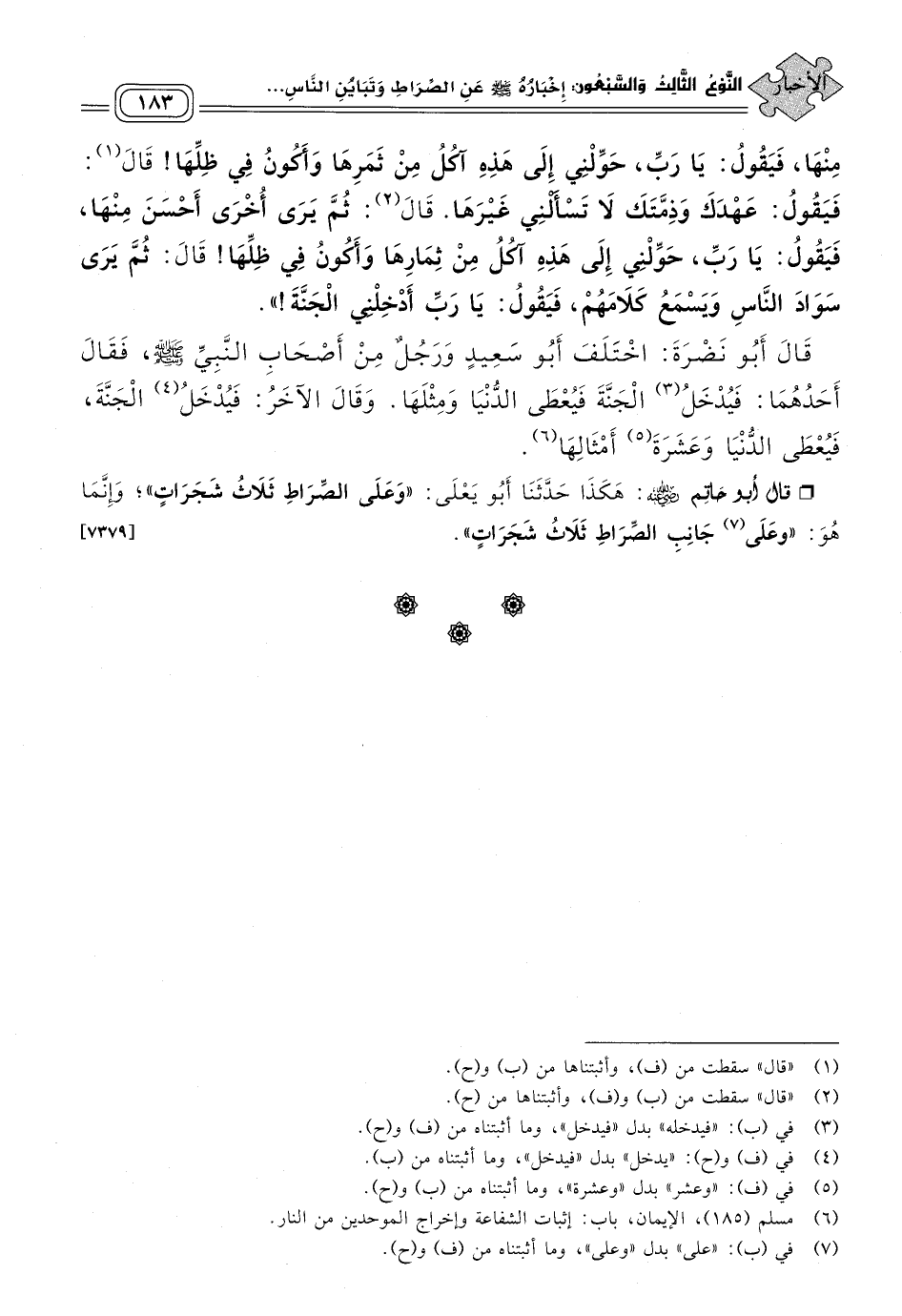 قَالَ أَبُو حَاتِمٍ رَضِيَ اللهُ عَنْهُ: هَكَذَا حَدثنا أَبُو يَعْلَى: "وَعَلَى الصِّرَاطِ ثَلَاثُ شَجَرَاتٍ"، وَإِنَّمَا هُوَ: "وَعَلَى جَانِبِ الصِّرَاطِ ثَلَاثُ شَجَرَاتٍ". [٧٣٧٩]