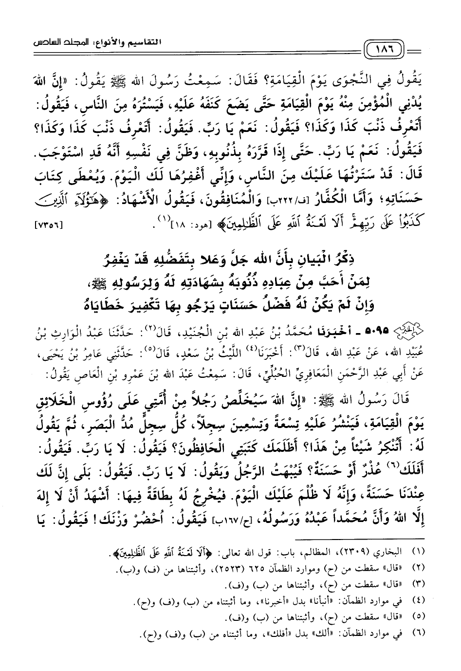 ٥٠٩٥ - أَخبَرنا مُحَمَّدُ بْنُ عَبْدِ اللهِ بْنِ الْجُنَيْدِ، قَالَ: حَدثنا عَبْدُ الْوَارِثِ بْنُ عُبَيْدِ اللهِ، عَنْ عَبْدِ اللهِ، قَالَ: أَخبَرنا اللَّيْثُ بْنُ سَعْدٍ، قَالَ: حَدَّثَنِي عَامِرُ بْنُ يَحْيَى، عَنْ أَبِي عَبْدِ الرَّحْمَنِ الْمَعَافِرِيِّ الْحُبُلِيِّ، قَالَ: سَمِعْتُ عَبْدَ اللهِ بْنَ عَمْرِو بْنِ الْعَاصِ يَقُولُ: قَالَ رَسُولُ اللهِ صَلى الله عَلَيه وسَلم: "إِنَّ اللهَ سَيُخَلِّصُ رَجُلاً مِنْ أُمَّتِي عَلَى رُؤُوسِ الْخَلَائِقِ يَوْمَ الْقِيَامَةِ، فَيَنْشُرُ عَلَيْهِ تِسْعَةً وَتِسْعِينَ سِجِلّاً، كُلُّ سِجِلٍّ مَدُّ الْبَصَرِ، ثُمَّ يَقُولُ لَهُ: أَتُنْكِرُ شَيْئًا مِنْ هَذَا؟ أَظَلَمَكَ كَتَبَتِي الْحَافِظُونَ؟ فَيَقُولُ: لَا يَا رَبِّ، فَيَقُولُ: أَفَلَكَ عُذْرٌ أَوْ حَسَنَةٌ؟ فَيُبْهَتُ الرَّجُلُ وَيَقُولُ: لَا يَا رَبِّ، فَيَقُولُ: بَلَى إِنَّ لَكَ عِنْدَنَا حَسَنَةً، وَإِنَّهُ لَا ظُلْمَ عَلَيْكَ الْيَوْمَ، فَيُخْرِجُ لَهُ بِطَاقَةً فِيهَا: أَشْهَدُ أَنْ لَا إِلَهَ إِلَاّ اللهُ وَأَنَّ مُحَمَّدًا عَبْدُهُ وَرَسُولُهُ، فَيَقُولُ: اُحْضُرْ وَزْنَكَ، فَيَقُولُ: يَا رَبِّ، مَا هَذِهِ الْبِطَاقَةُ مَعَ هَذِهِ السِّجِلَّاتِ! فَيَقُولُ: إِنَّكَ لَا تُظْلَمُ، قَالَ: فَتُوضَعُ السِّجِلَّاتُ فِي كِفَّةٍ وَالْبِطَاقَةُ فِي كِفَّةٍ، فَطَاشَتِ السِّجِلَّاتُ، وَثَقُلَتِ الْبِطَاقَةُ، قَالَ: فَلَا يَثْقُلُ اسْمَ اللهِ شَيْءٌ". [٢٢٥]