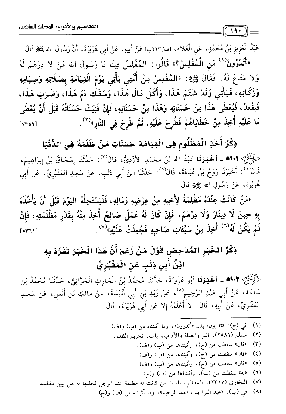 ٥١٠١ - أَخبَرنا عَبْدُ اللهِ بْنُ مُحَمَّدٍ الأَزْدِيُّ، قَالَ: حَدثنا إِسْحَاقُ بْنُ إِبْرَاهِيمَ، قَالَ: أَخبَرنا رَوْحُ بْنُ عُبَادَةَ، قَالَ: حَدثنا ابْنُ أَبِي ذِئْبٍ، عَنْ سَعِيدٍ الْمَقْبُرِيِّ، عَنْ أَبِي هُرَيْرَةَ، عَنْ رَسُولِ اللهِ صَلى الله عَلَيه وسَلم قَالَ: "مَنْ كَانَتْ عِنْدَهُ مَظْلَمَةٌ لأَخِيهِ مِنْ عِرْضِهِ وَمَالِهِ، فَلْيَسْتَحِلَّهُ الْيَوْمَ قَبْلَ أَنْ يَأْخُذَهُ بِهِ حِينَ لَا دِينَارَ وَلَا دِرْهَمَ، فَإِنْ كَانَ لَهُ عَمَلٌ صَالِحٌ أُخِذَ مِنْهُ بِقَدْرِ مَظْلَمَتِهِ، فَإِنْ لَمْ يَكُنْ له أُخِذَ مِنْ سَيِّئَاتِ صَاحِبِهِ فَجُعِلَتْ عَلَيْهِ". [٧٣٦١]