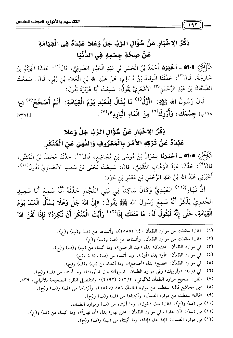 ٥١٠٤ - أَخبَرنا أَحْمَدُ بْنُ الْحَسَنِ بْنِ عَبْدِ الْجَبَّارِ الصُّوفِيُّ، قَالَ: حَدثنا الْهَيْثَمُ بْنُ خَارِجَةَ، قَالَ: حَدثنا الْوَلِيدُ بْنُ مُسْلِمٍ، عَنْ عَبْدِ اللهِ بْنِ الْعَلَاءِ بْنِ زَبْرٍ، قَالَ: سَمِعْتُ الضَّحَّاكَ بْنَ عَبْدِ الرَّحْمَنِ الأَشْعَرِيَّ يَقُولُ: سَمِعْتُ أَبَا هُرَيْرَةَ يَقُولُ: قَالَ رَسُولُ اللهِ صَلى الله عَلَيه وسَلم: "أَوَّلُ مَا يُقَالُ لِلْعَبْدِ يَوْمَ الْقِيَامَةِ: أَلَمْ أُصَحِّحْ جِسْمَكَ، وَأَرْوِكَ مِنَ الْمَاءِ الْبَارِدِ؟ ". [٧٣٦٤]