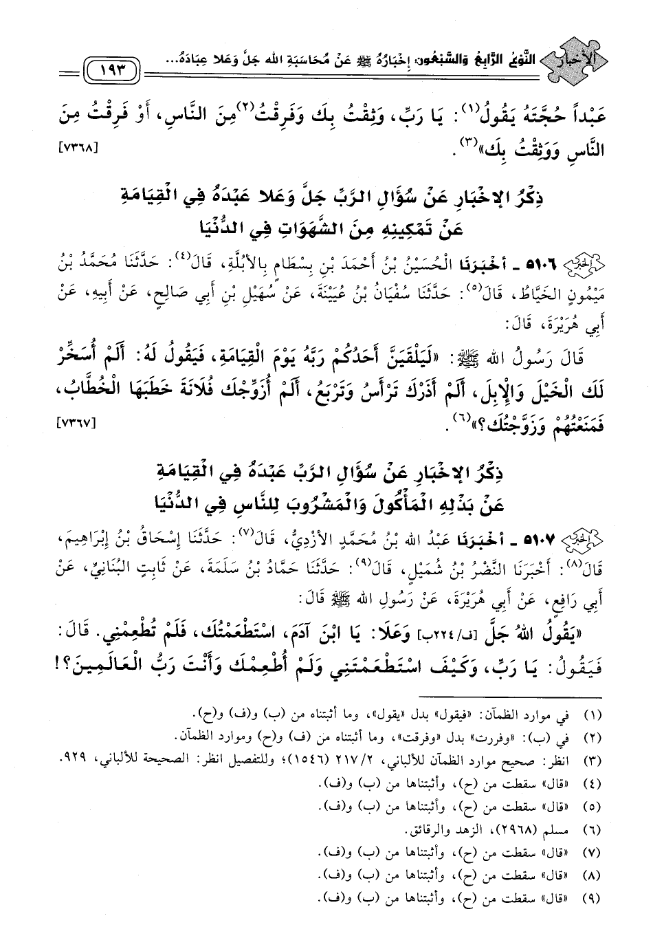 ٥١٠٦ - أَخبَرنا الْحُسَيْنُ بْنُ أَحْمَدَ بْنِ بِسْطَامٍ، بِالأُبُلَّةِ، قَالَ: حَدثنا مُحَمَّدُ بْنُ مَيْمُونٍ الْخَيَّاطُ، قَالَ: حَدثنا سُفْيَانُ بْنُ عُيَيْنَةَ، عَنْ سُهَيْلِ بْنِ أَبِي صَالِحٍ، عَنْ أَبِيهِ، عَنْ أَبِي هُرَيْرَةَ، قَالَ: قَالَ رَسُولُ اللهِ صَلى الله عَلَيه وسَلم: "لَيَلْقَيَنَّ أَحَدُكُمْ رَبَّهُ يَوْمَ الْقِيَامَةِ، فَيَقُولُ لَهُ: أَلَمْ أُسَخِّرْ لَكَ الْخَيْلَ وَالإِبِلَ؟ أَلَمْ أَذَرْكَ تَرْأَسُ وَتَرْبَعُ؟ أَلَمْ أُزَوِّجْكَ فُلَانَةَ خَطَبَهَا الْخُطَّابُ، فَمَنَعْتُهُمْ وَزَوَّجْتُكَ؟ ". [٧٣٦٧]