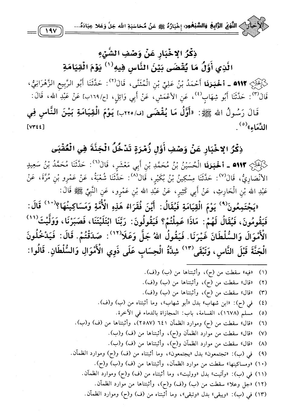 ٥١١٢ - أَخبَرنا أَحْمَدُ بْنُ عَلِيِّ بْنِ الْمُثَنَّى، قَالَ: حَدثنا أَبُو الرَّبِيعِ الزَّهْرَانِيُّ، قَالَ: حَدثنا أَبُو شِهَابٍ، عَنِ الأَعْمَشِ، عَنْ أَبِي وَائِلٍ، عَنْ عَبْدِ اللهِ، قَالَ: قَالَ رَسُولُ اللهِ صَلى الله عَلَيه وسَلم: "أَوَّلُ مَا يُقْضَى يَوْمَ الْقِيَامَةِ بَيْنَ النَّاسِ فِي الدِّمَاءِ". [٧٣٤٤]