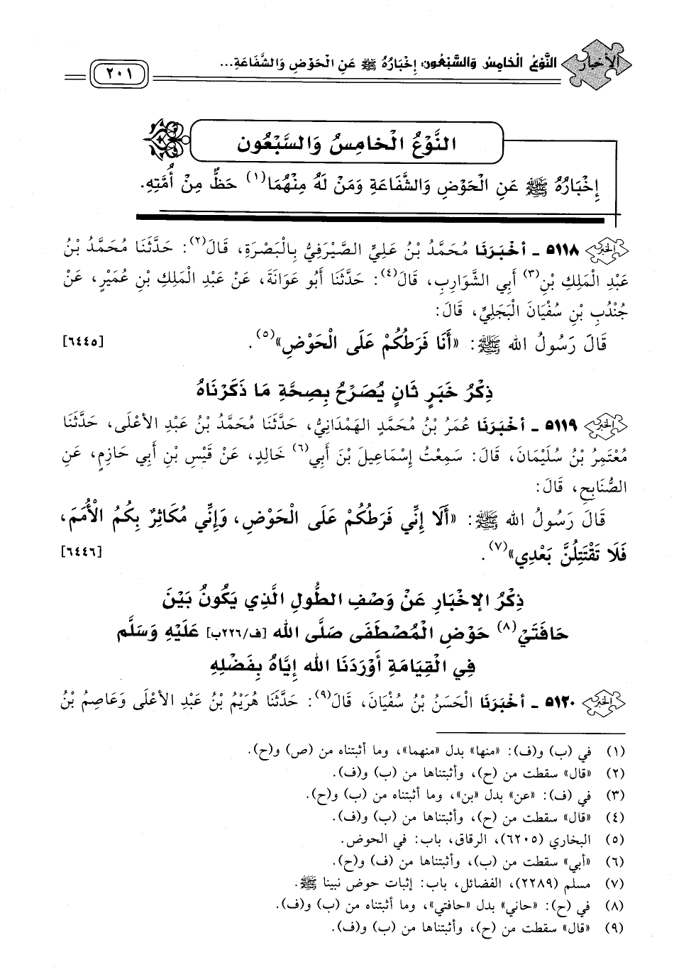 ٥١١٩ - أَخبَرنا عُمَرُ بْنُ مُحَمَّدٍ الْهَمْدَانِيُّ، حَدثنا مُحَمَّدُ بْنُ عَبْدِ الأَعْلَى، حَدثنا مُعْتَمِرُ بْنُ سُلَيْمَانَ، قَالَ: سَمِعْتُ إِسْمَاعِيلَ بْنَ أَبِي خَالِدٍ، عَنْ قَيْسِ بْنِ أَبِي حَازِمٍ، عَنِ الصُّنَابِحِ، قَالَ: قَالَ رَسُولُ اللهِ صَلى الله عَلَيه وسَلم: "أَلَا إِنِّي فَرَطُكُمْ عَلَى الْحَوْضِ، وَإِنِّي مُكَاثِرٌ بِكُمُ الأُمَمَ، فَلَا تَقْتَتِلُنَّ بَعْدِي". [٦٤٤٦]