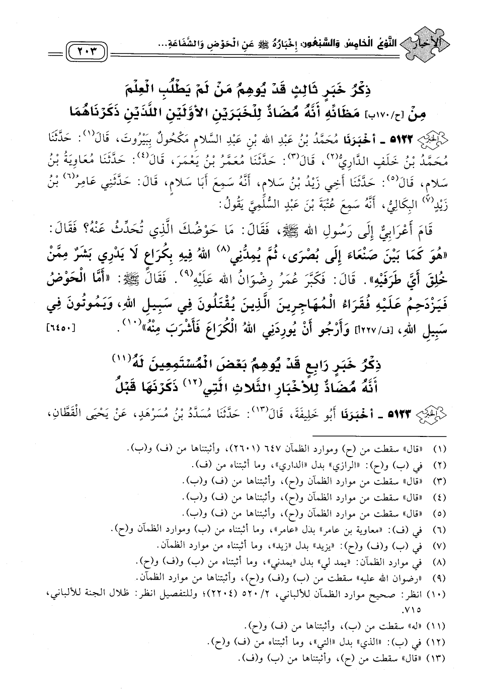 ٥١٢٢ - أَخبَرنا مُحَمَّدُ بْنُ عَبْدِ اللهِ بْنِ عَبْدِ السَّلَامِ مَكْحُولٌ بِبَيْرُوتَ، قَالَ: حَدثنا مُحَمَّدُ بْنُ خَلَفٍ الدَّارِيُّ، قَالَ: حَدثنا مُعَمَّرُ بْنُ يَعْمَرَ، قَالَ: حَدثنا مُعَاوِيَةُ بْنُ سَلَاّمٍ، قَالَ: حَدثنا أَخِي زَيْدُ بْنُ سَلَاّمٍ، أَنَّهُ سَمِعَ أَبَا سَلَاّمٍ، قَالَ: حَدَّثَنِي عَامِرُ بْنُ زَيْدٍ الْبَكَالِيُّ، أَنَّهُ سَمِعَ عُتْبَةَ بْنَ عَبْدٍ السُّلَمِيَّ يَقُولُ: قَامَ أَعْرَابِيٌّ إِلَى رَسُولِ اللهِ صَلى الله عَلَيه وسَلم، فَقَالَ: مَا حَوْضُكَ الَّذِي تُحَدِّثُ عَنْهُ؟ فَقَالَ: "هُوَ كَمَا بَيْنَ صَنْعَاءَ إِلَى بُصْرَى، ثُمَّ يُمِدُّنِي اللهُ فِيهِ بِكُرَاعٍ لَا يَدْرِي بَشَرٌ مِمَّنْ خُلِقَ أَيُّ طَرَفَيْهِ"، قَالَ: فَكَبَّرَ عُمَرُ رضوان الله عليه، فَقَالَ صَلى الله عَلَيه وسَلم: "أَمَّا الْحَوْضُ فَيَزْدَحِمُ عَلَيْهِ فُقَرَاءُ الْمُهَاجِرِينَ الَّذِينَ يُقْتَلُونَ فِي سَبِيلِ اللهِ، وَيَمُوتُونَ فِي سَبِيلِ اللهِ، وَأَرْجُو أَنْ يُورِدَنِي اللهُ الْكُرَاعَ فَأَشْرَبَ مِنْهُ". [٦٤٥٠]